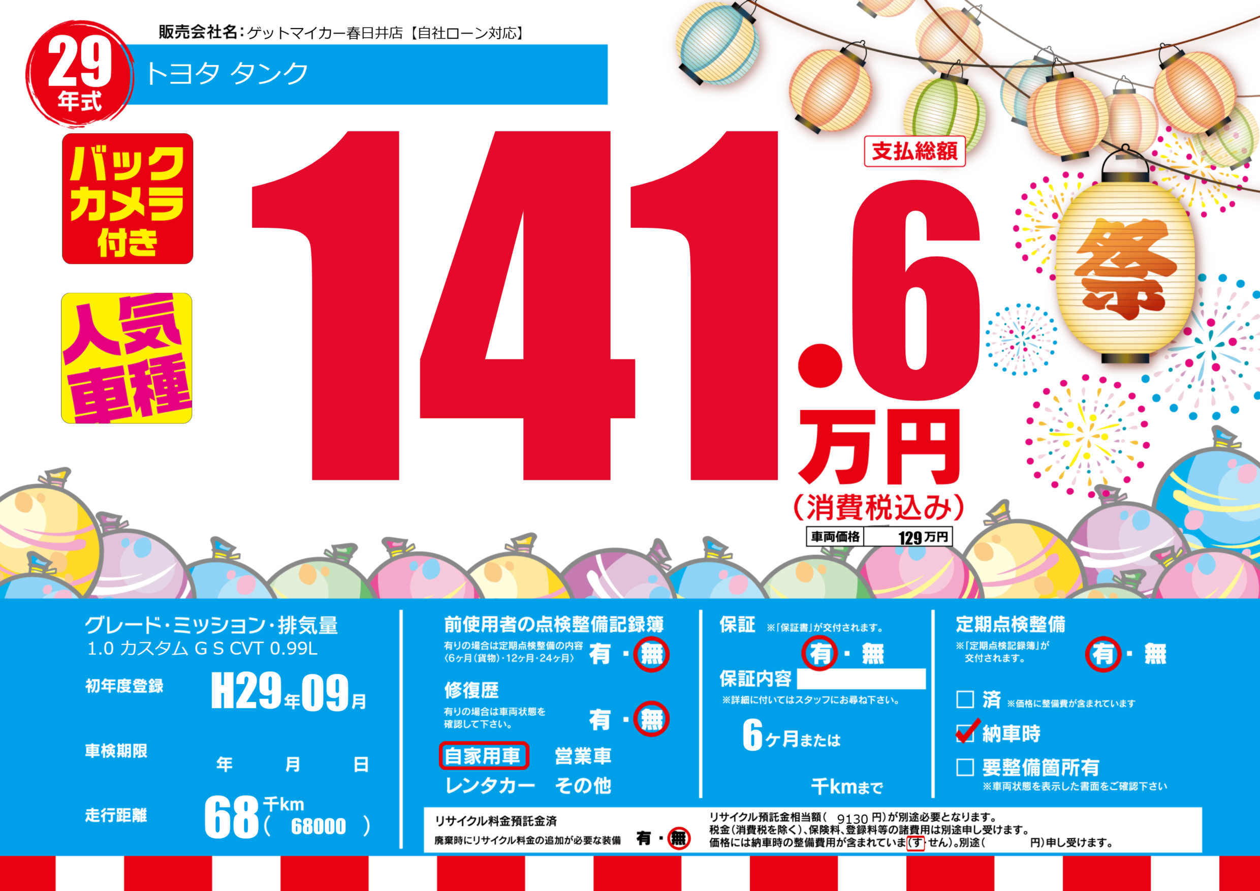 | 車名 | トヨタ タンク | グレード ミッション 排気量 |