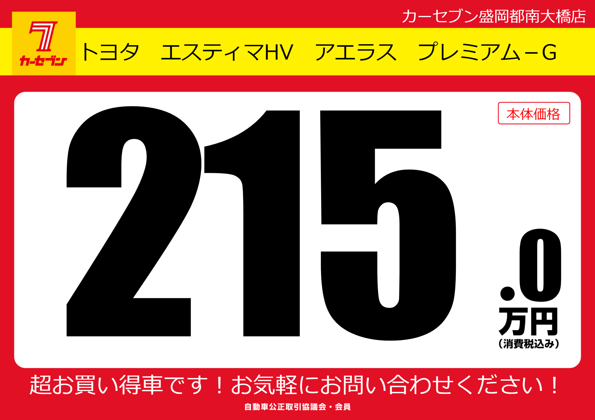 | 車名 | トヨタ エスティマHV アエラス プレミアム-G | グレード ミッション 排気量 |