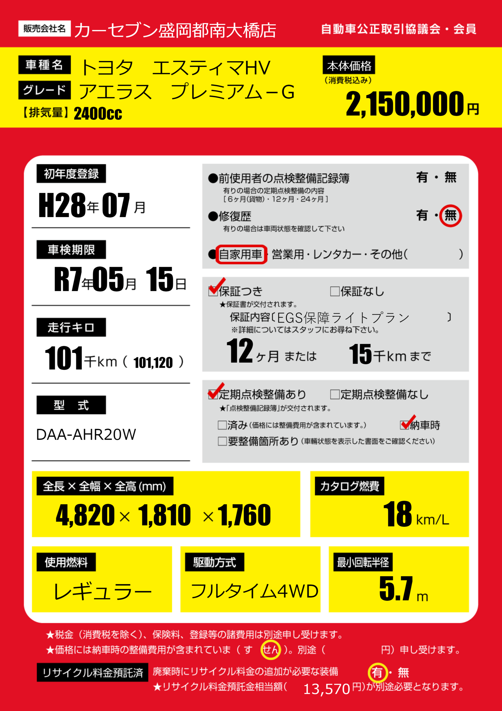 | 車名 | トヨタ エスティマHV | グレード ミッション 排気量 |