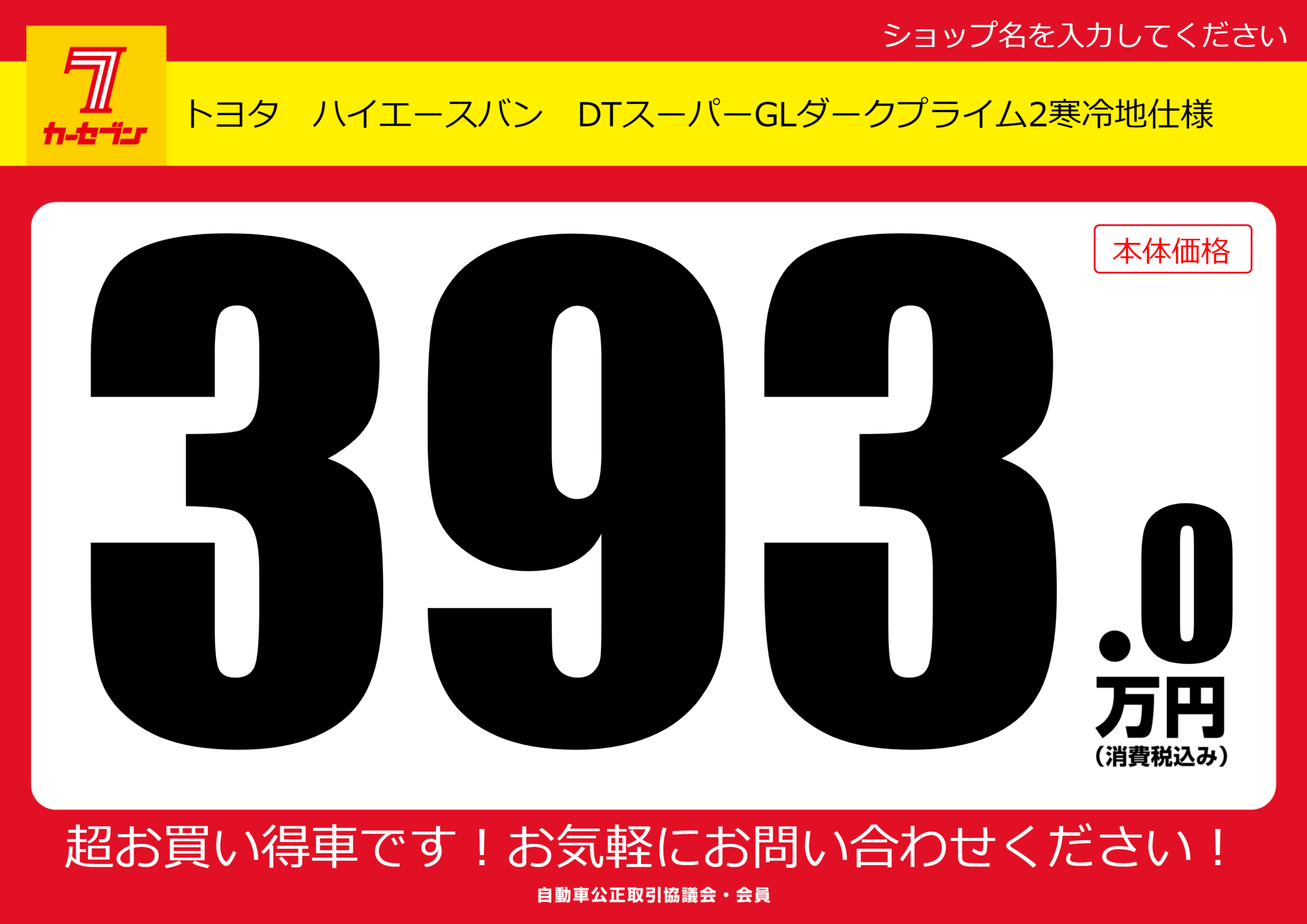 | 車名 | トヨタ ハイエースバン DTスーパーGLダークプライム2寒冷地仕様 | グレード ミッション 排気量 |