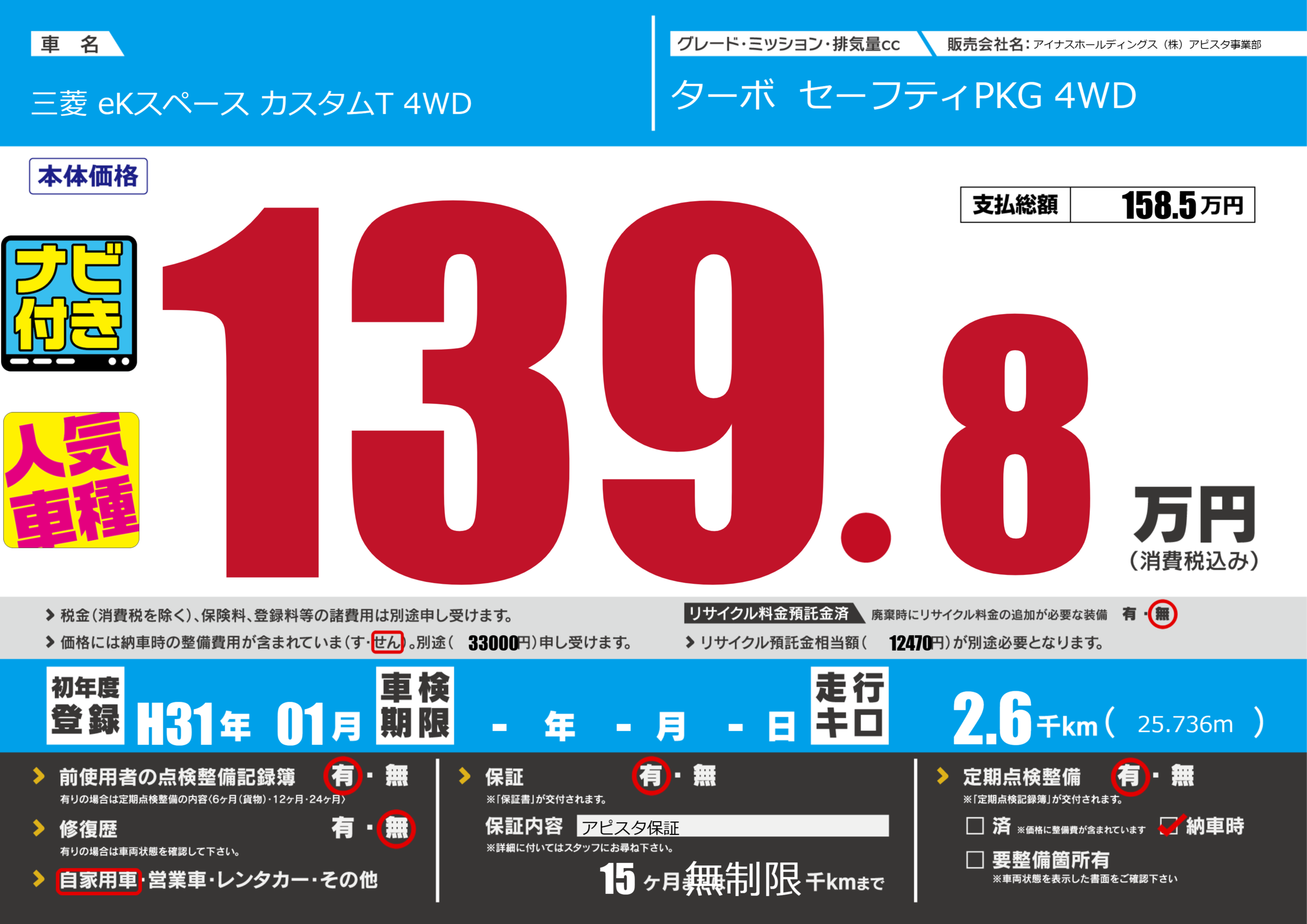 | 定期点検整備 | 定期点検整備あり 納車時あり | ||