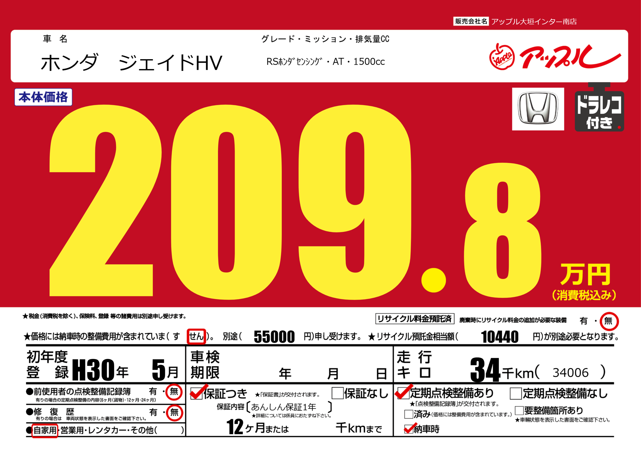 | 車名 | ホンダ ジェイドHV | グレード ミッション 排気量 |