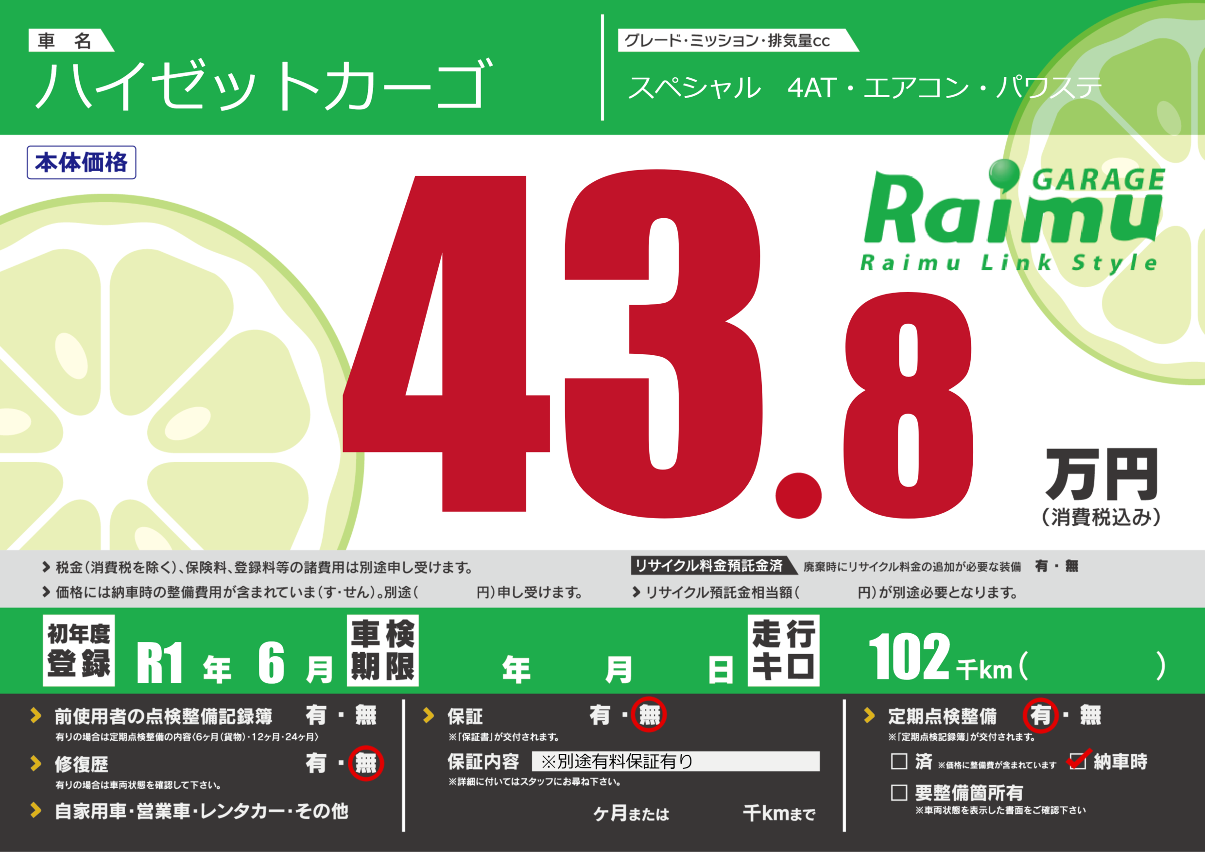 | 車名 | ハイゼットカーゴ | グレード ミッション 排気量 |