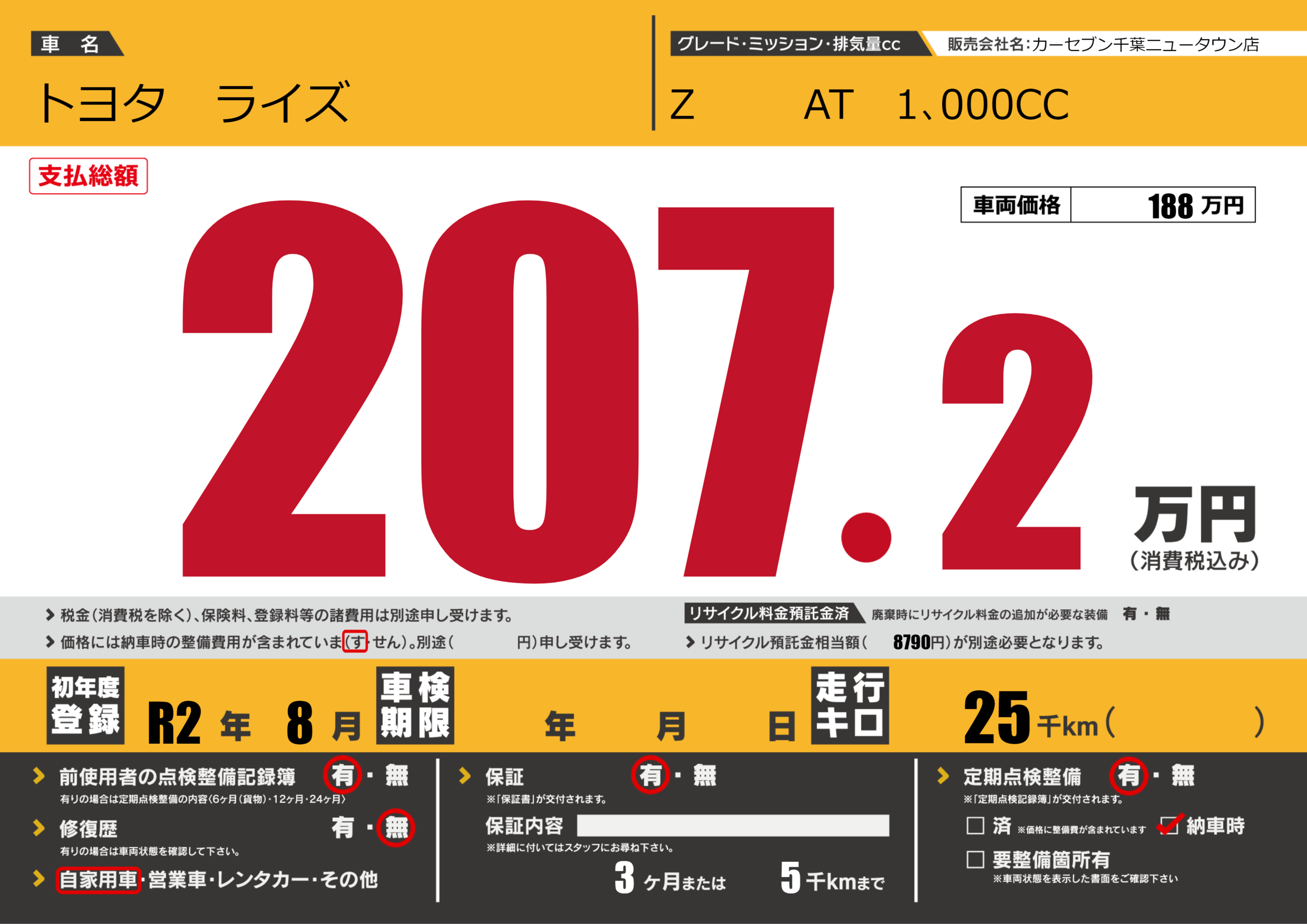 | 車名 | トヨタ ライズ | グレード ミッション 排気量 |
