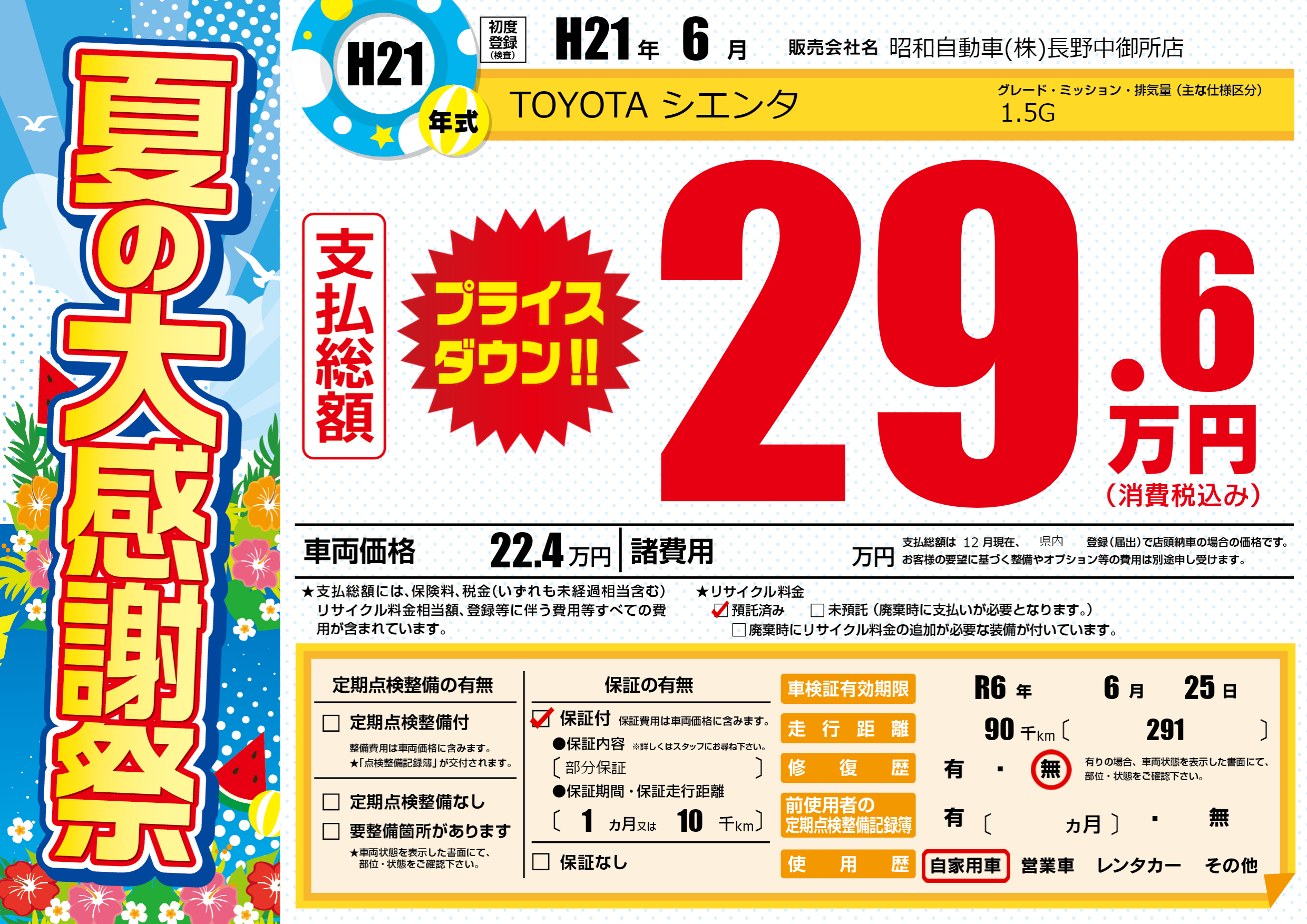 | 走行キロ | 9万km | 初年度登録 | H21年6月 |