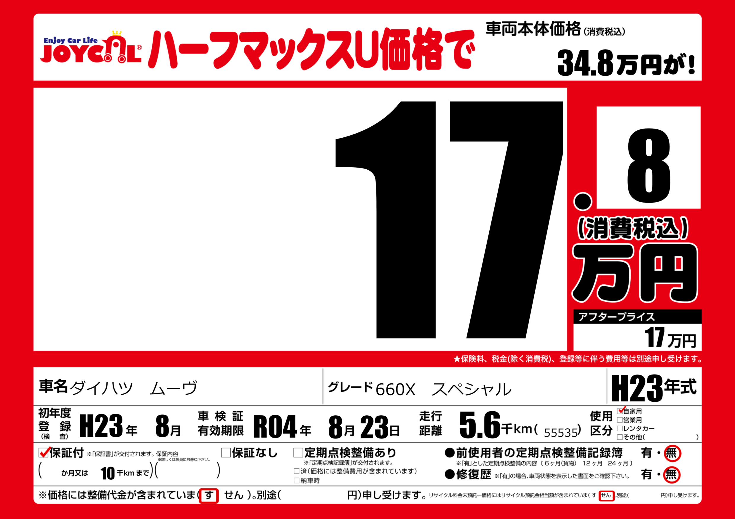 保証なし 保証内容(---) ---ヶ月または(10)千kmまで |