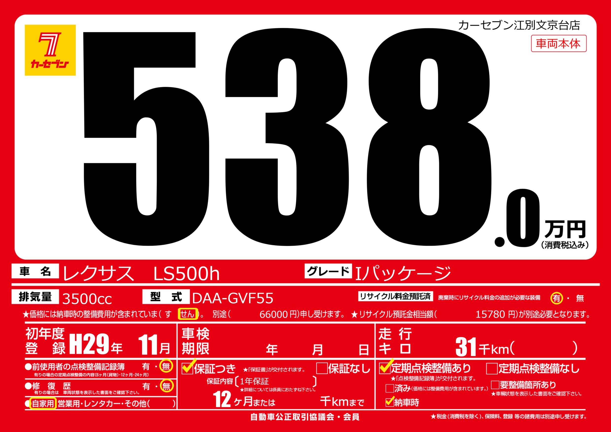 | 車名 | レクサス LS500h | グレード ミッション 排気量 |