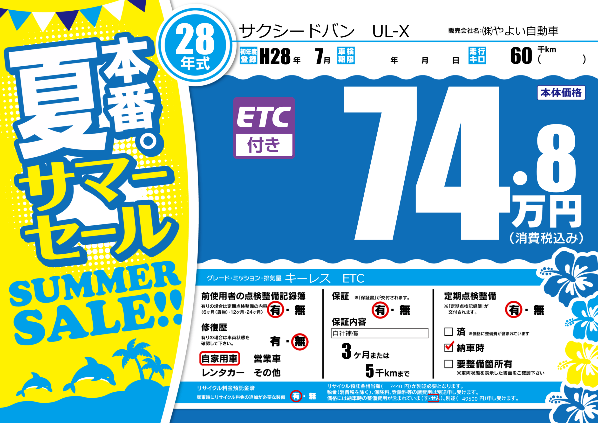 | 走行キロ | 6万km | 初年度登録 | H28年7月 |