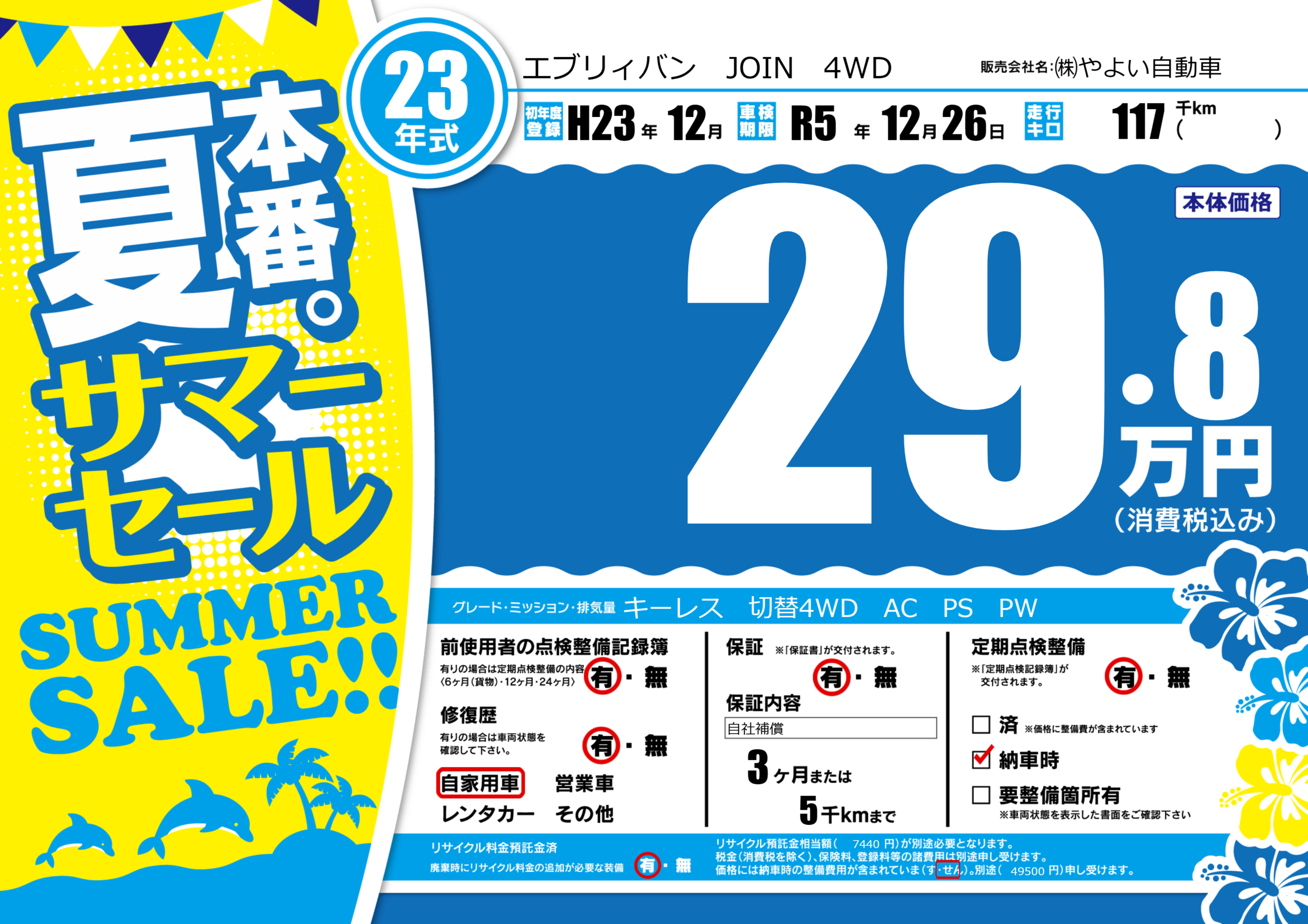 | 車名 | エブリィバン JOIN 4WD | グレード ミッション 排気量 |