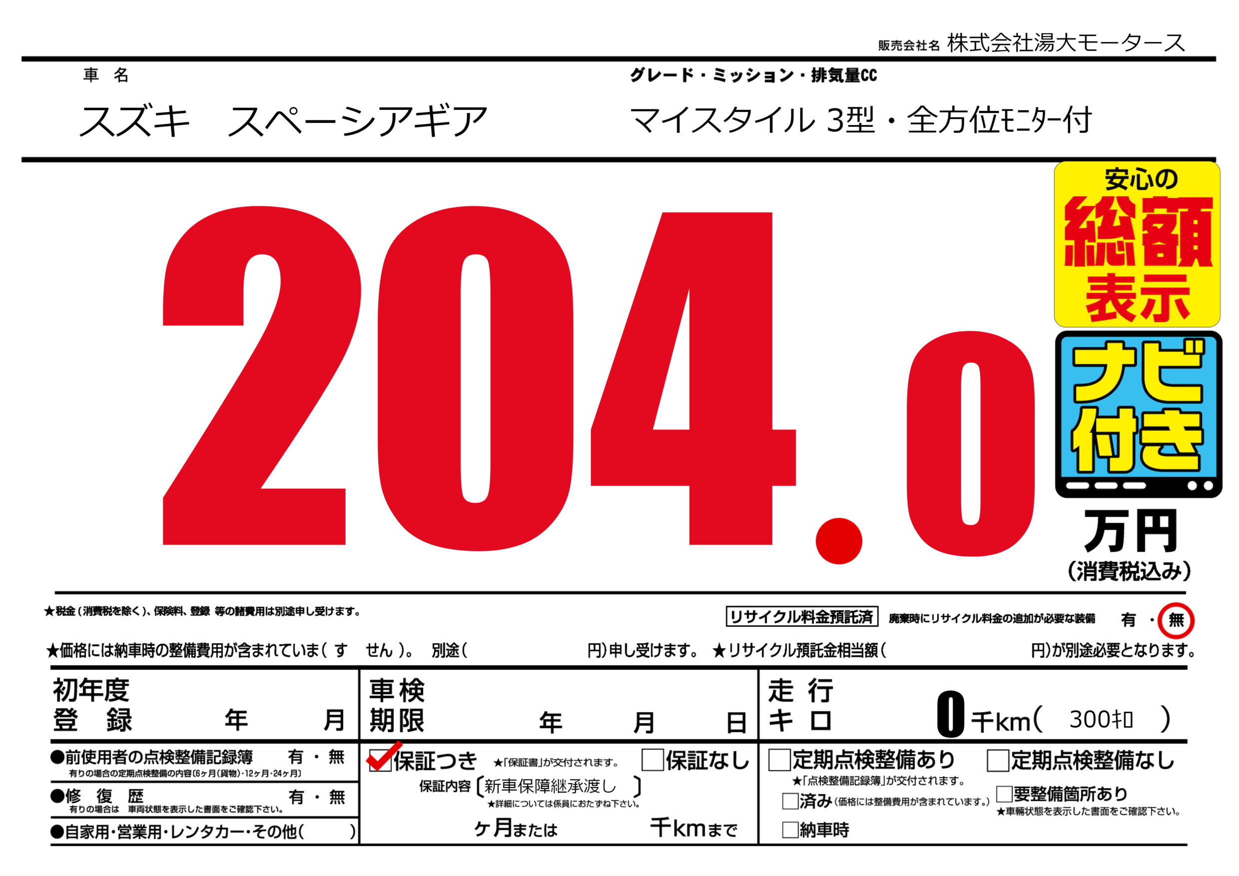 | 車名 | スズキ スペーシアギア | グレード ミッション 排気量 |
