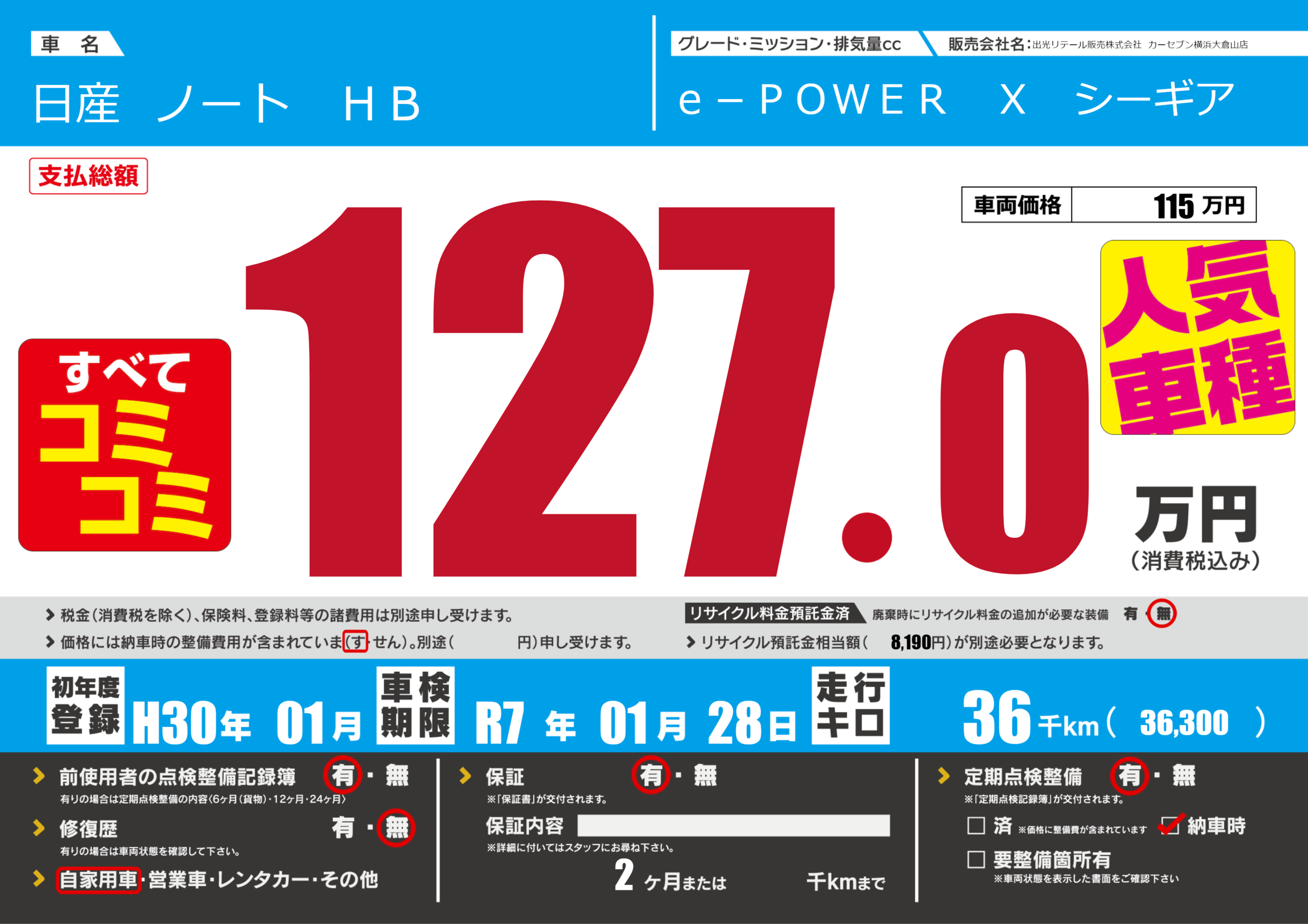 | 車名 | 日産 ノート HB | グレード ミッション 排気量 |