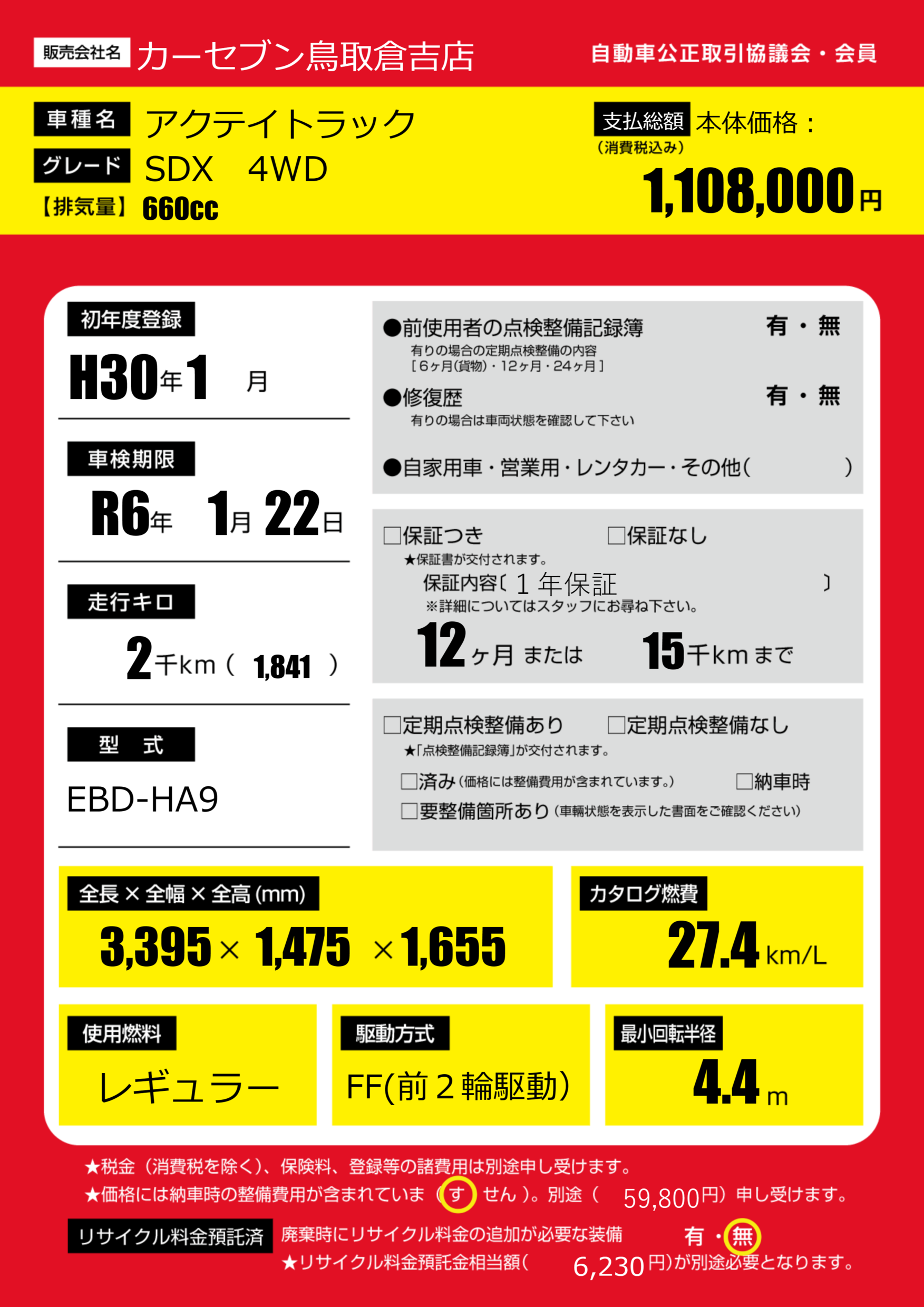| 車名 | アクテイトラック | グレード ミッション 排気量 |