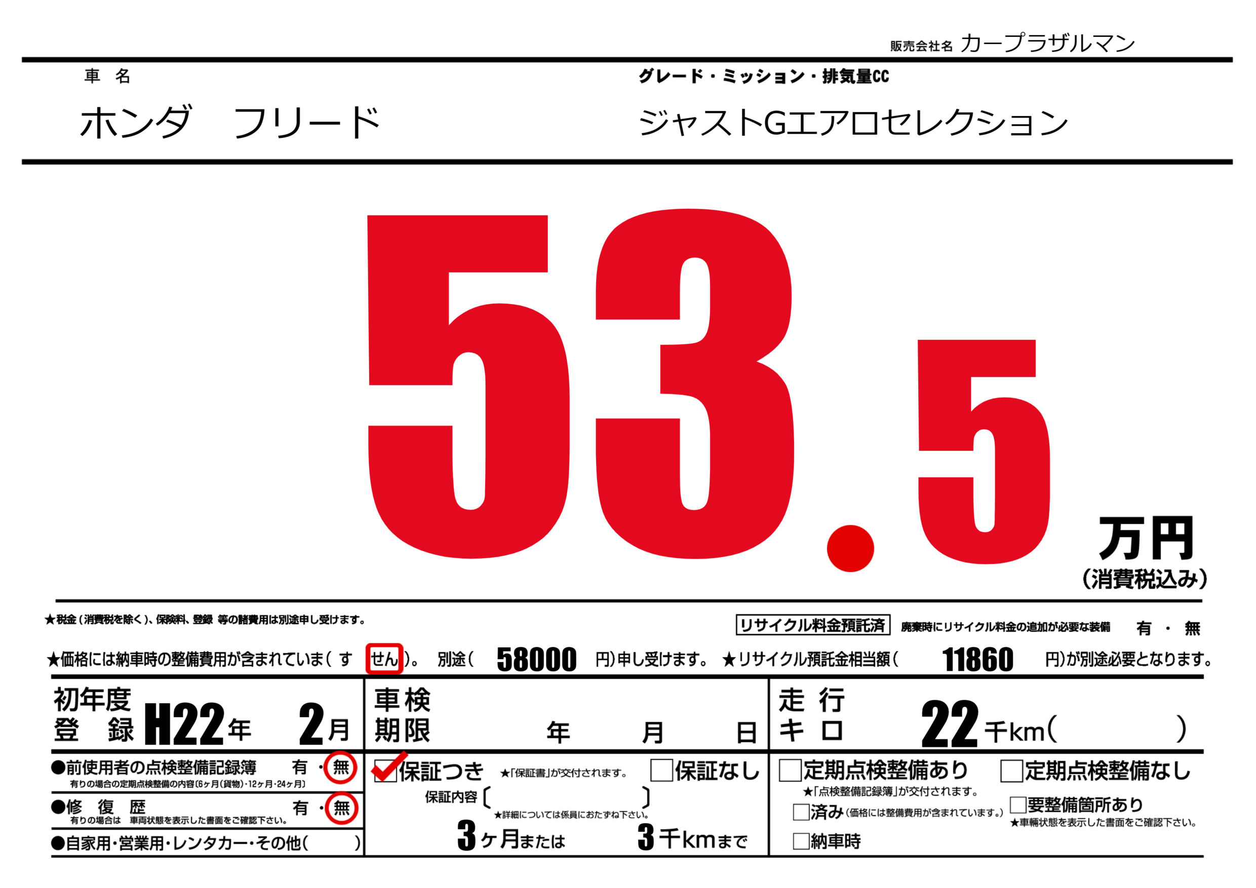 | 車名 | ホンダ フリード | グレード ミッション 排気量 |