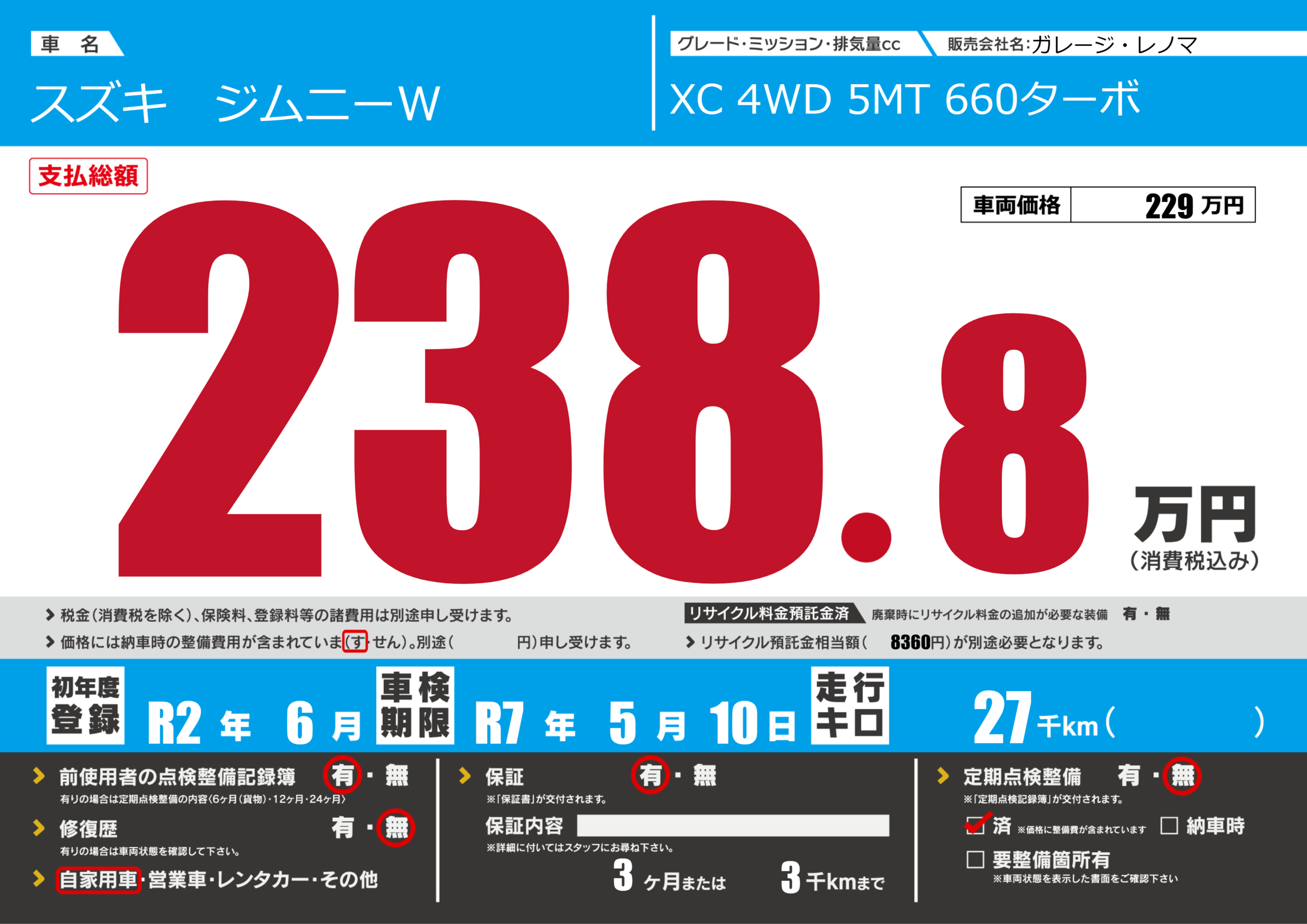 | 車名 | スズキ ジムニーW | グレード ミッション 排気量 |