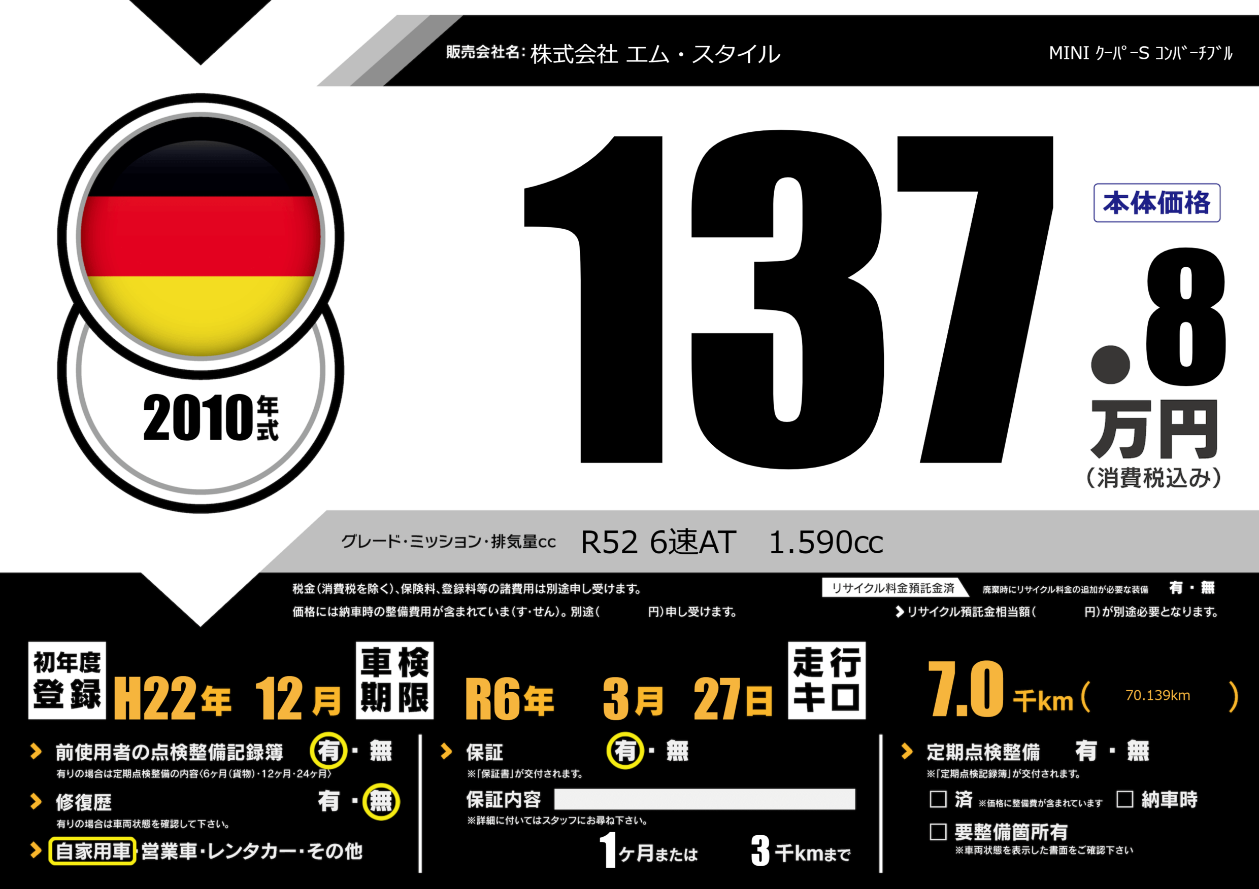 | 車名 | MINI クーパーS コンバーチブル | グレード ミッション 排気量 |