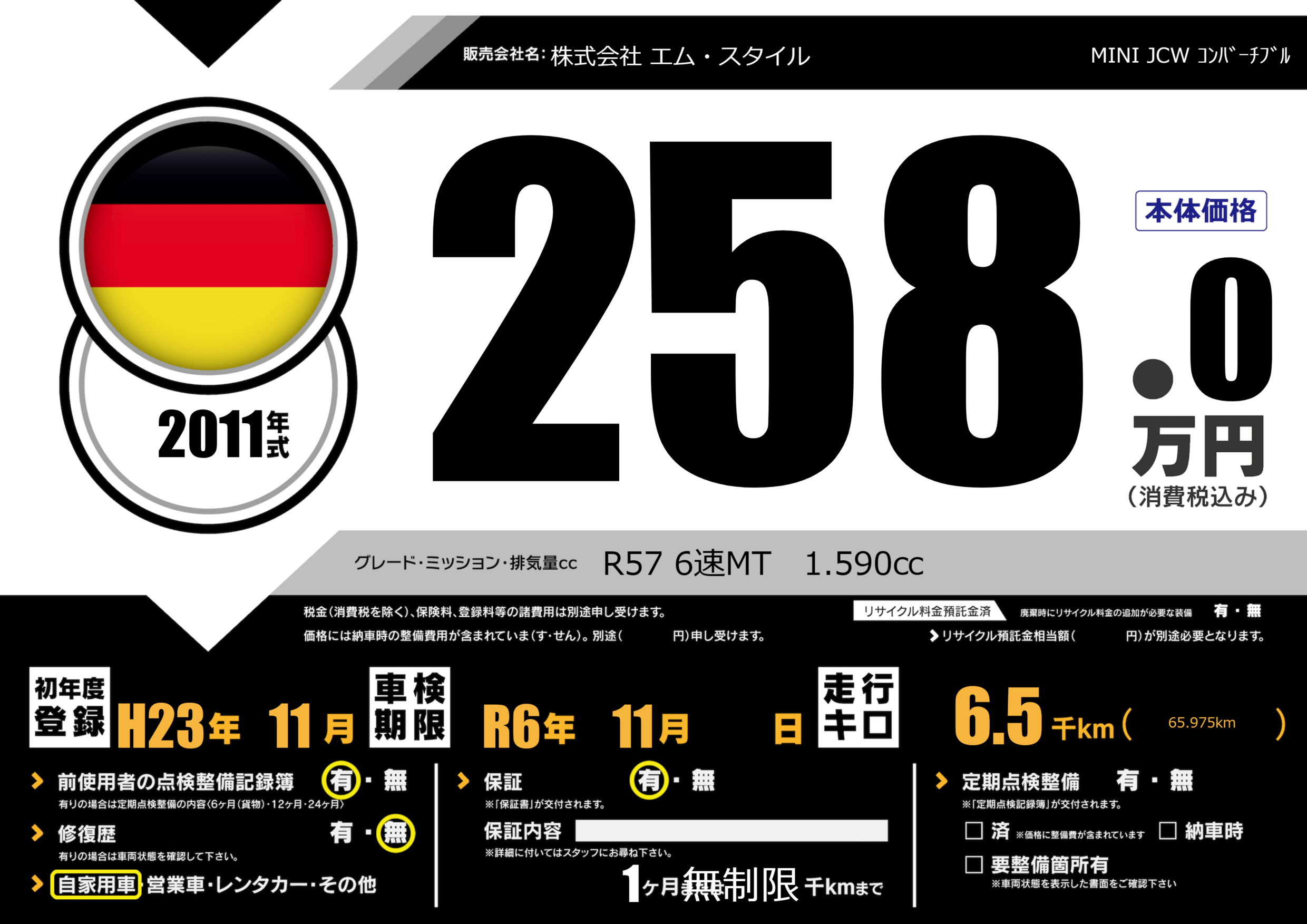 | 車名 | MINI JCW コンバーチブル | グレード ミッション 排気量 |