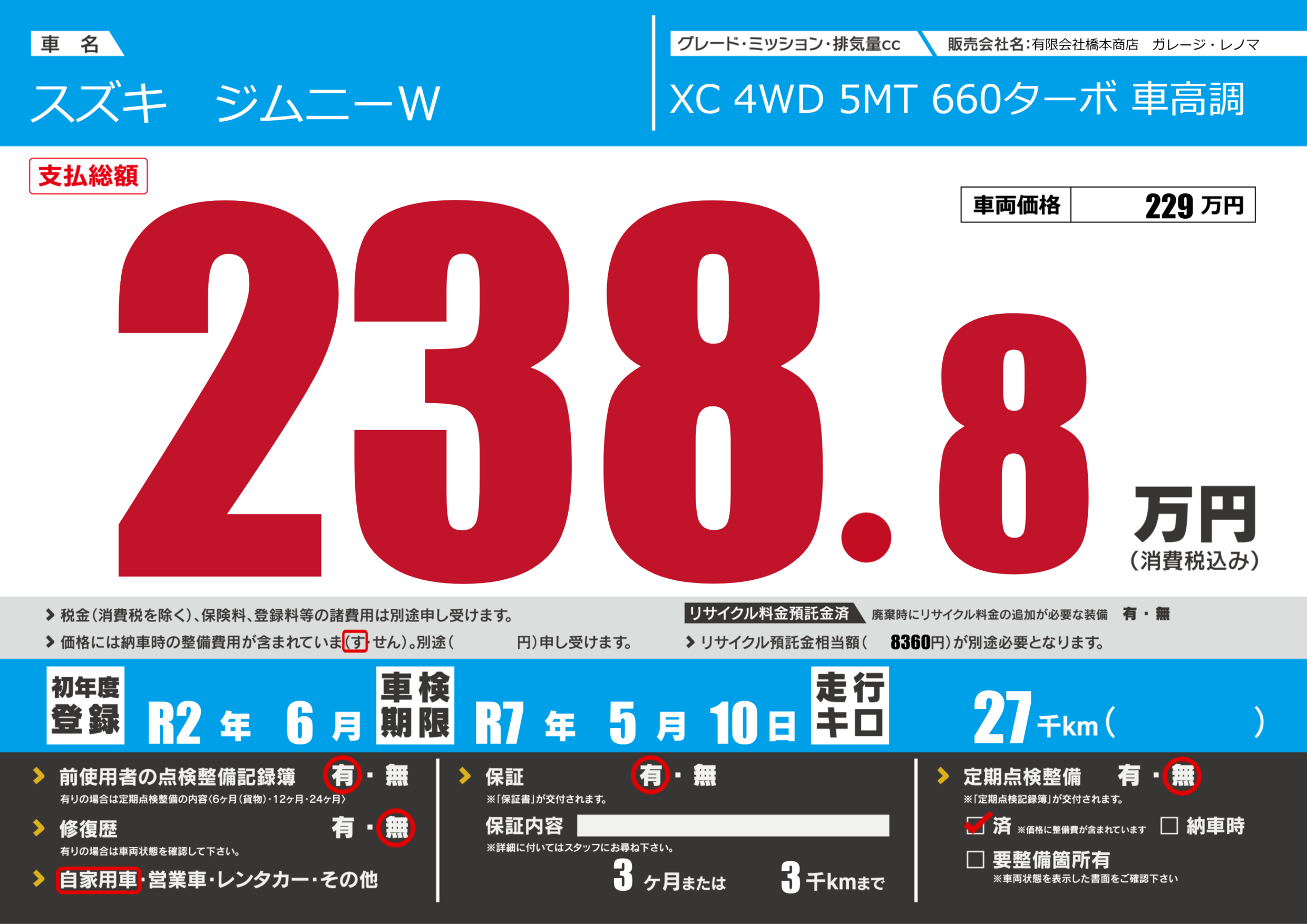 | 車検制限 | R7年 5月 10日 | ||