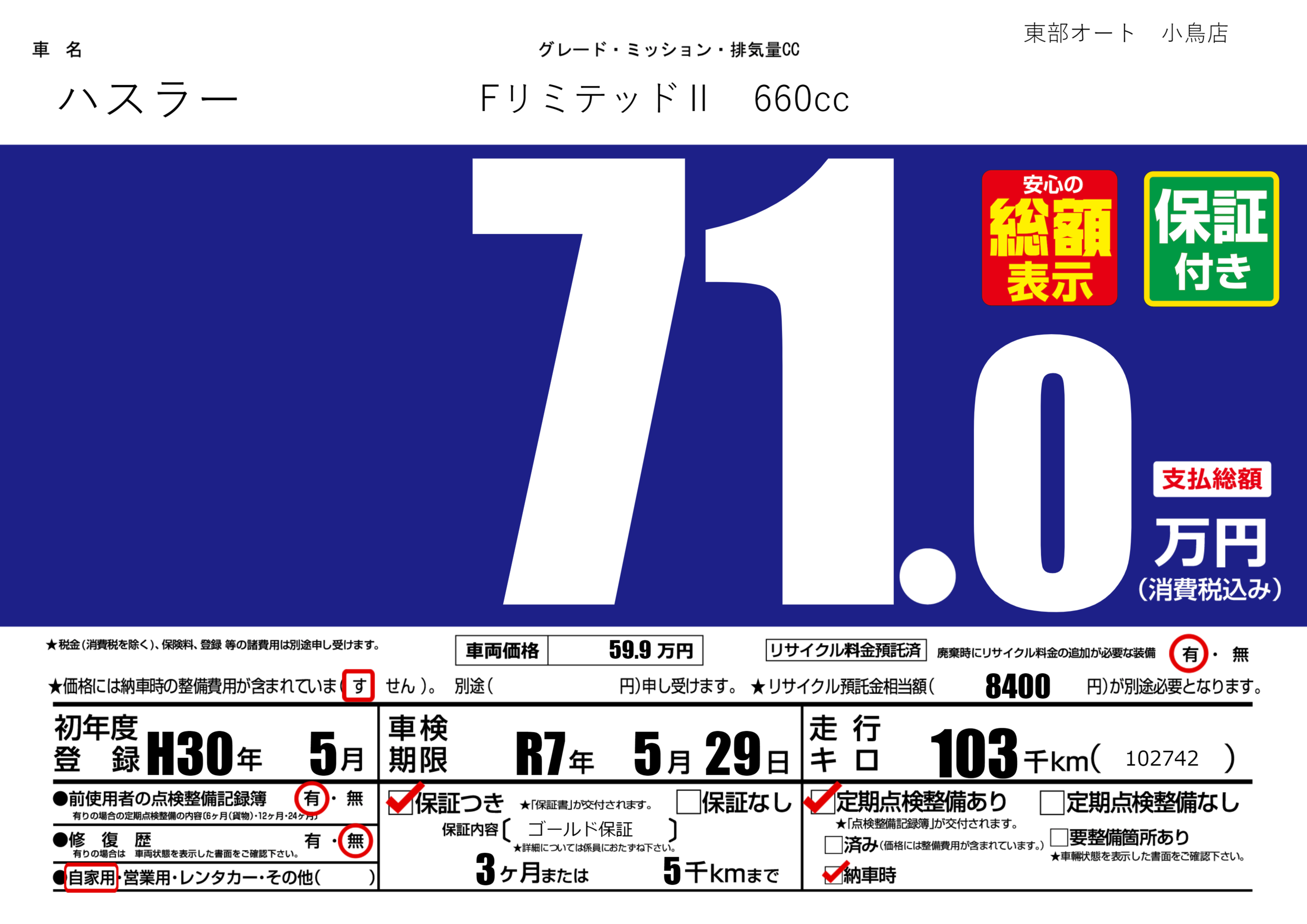 | 車名 | ハスラー | グレード ミッション 排気量 |