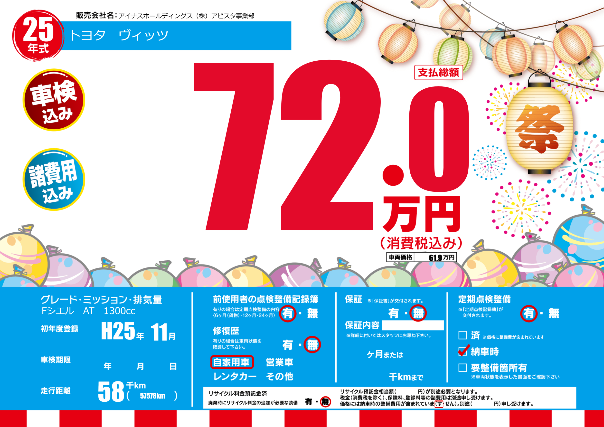 | 車名 | トヨタ ヴィッツ | グレード ミッション 排気量 |