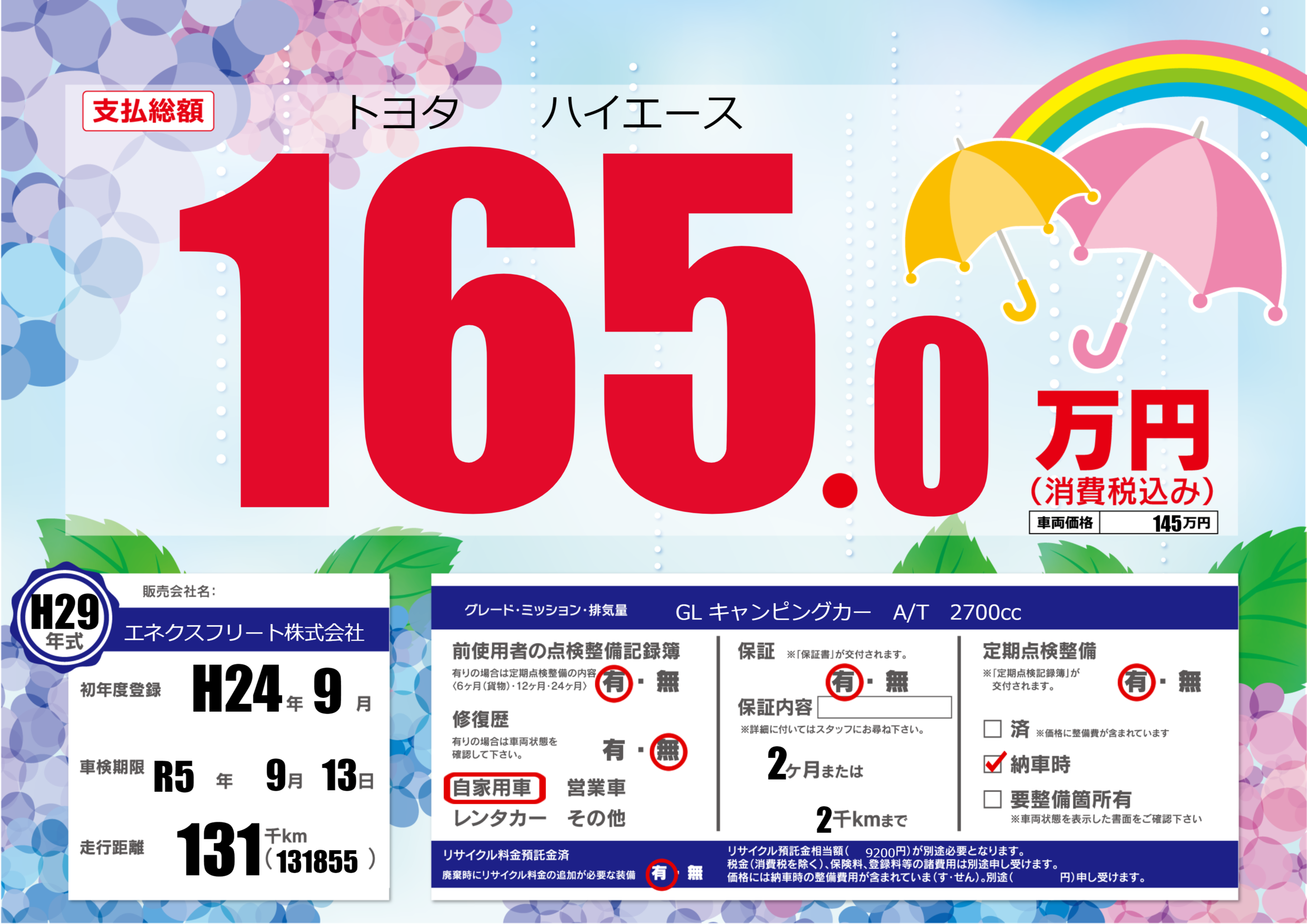 | 車名 | トヨタ ハイエース | グレード ミッション 排気量 |
