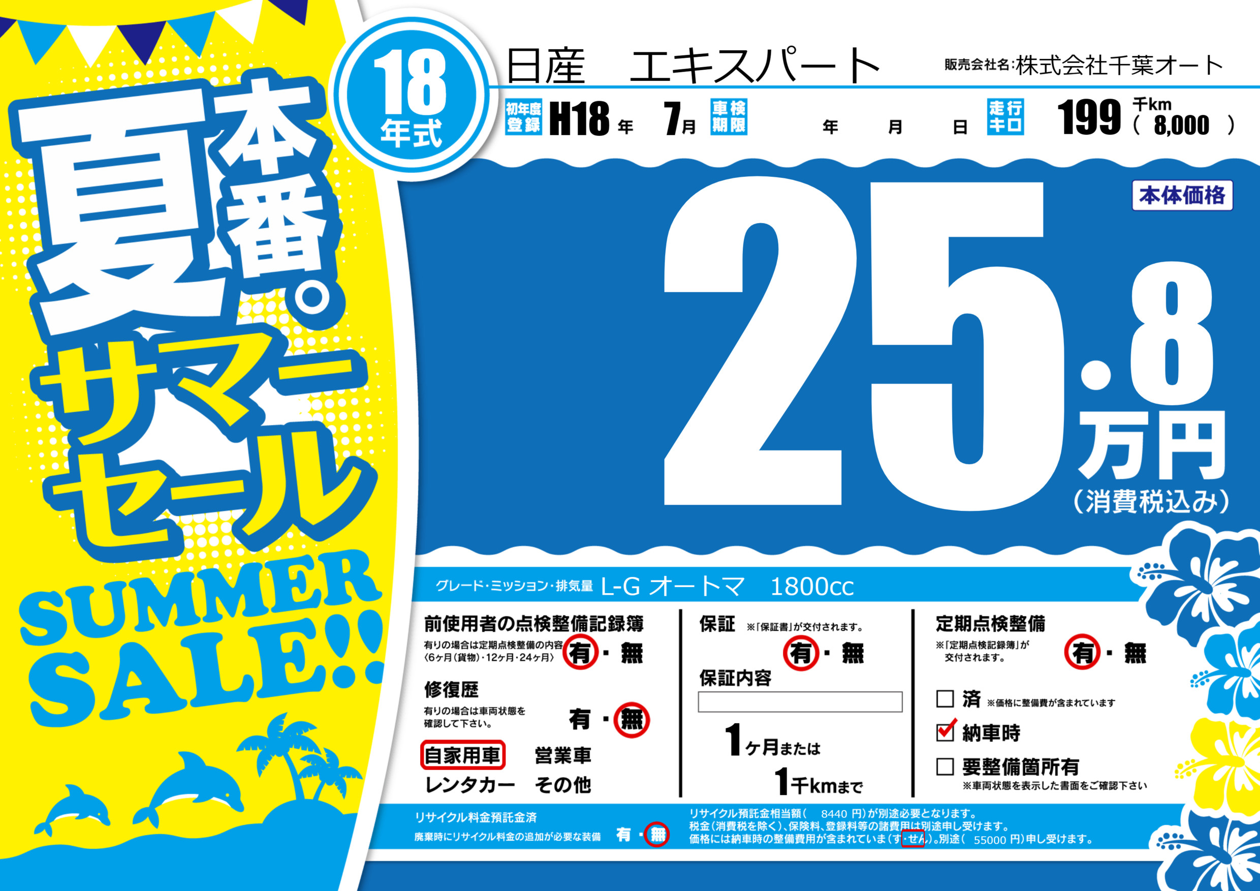 | 走行キロ | 19.9万km | 初年度登録 | H18年7月 |
