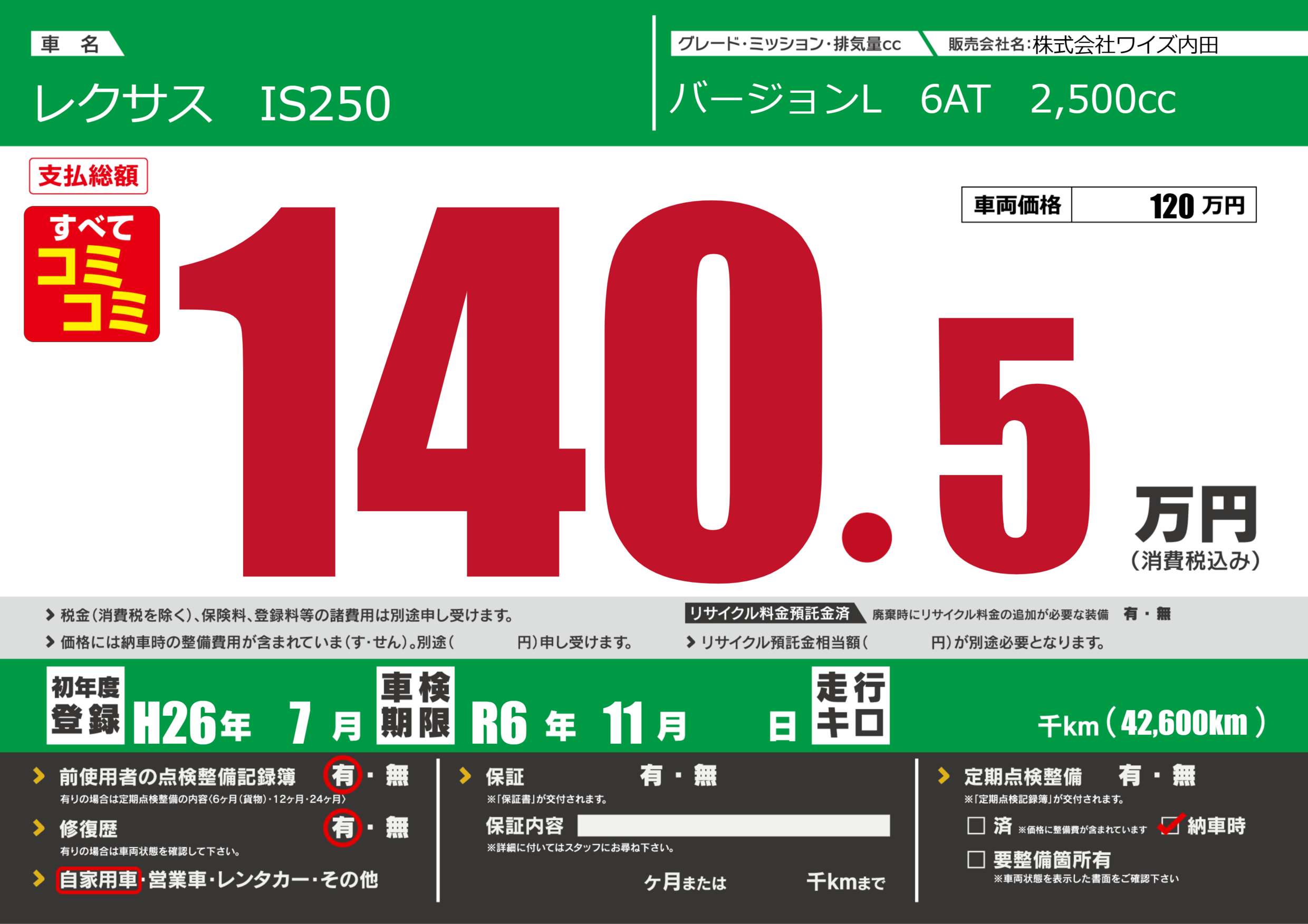 | 車名 | レクサス IS250 | グレード ミッション 排気量 |