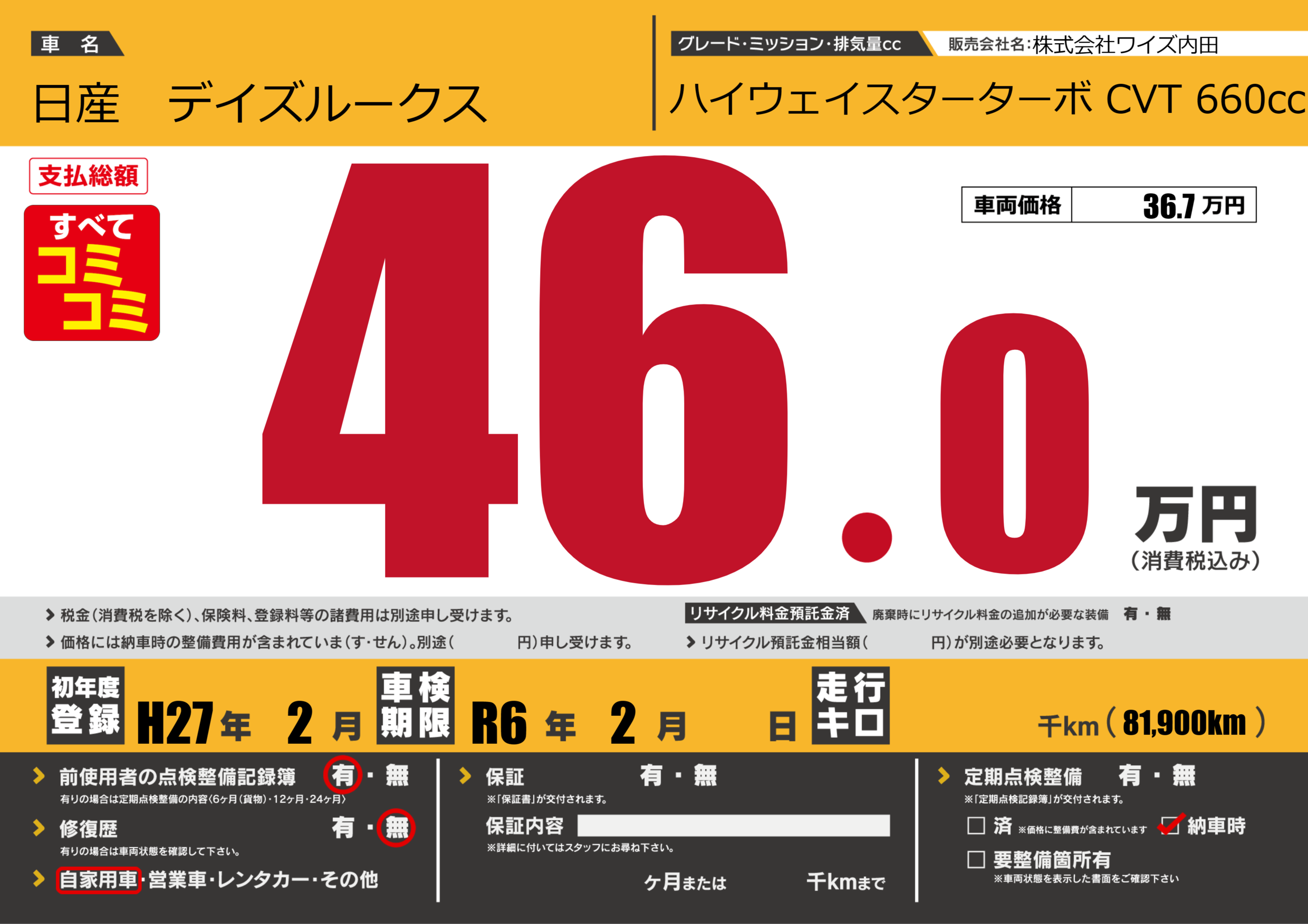 | 車名 | 日産 デイズルークス | グレード ミッション 排気量 |