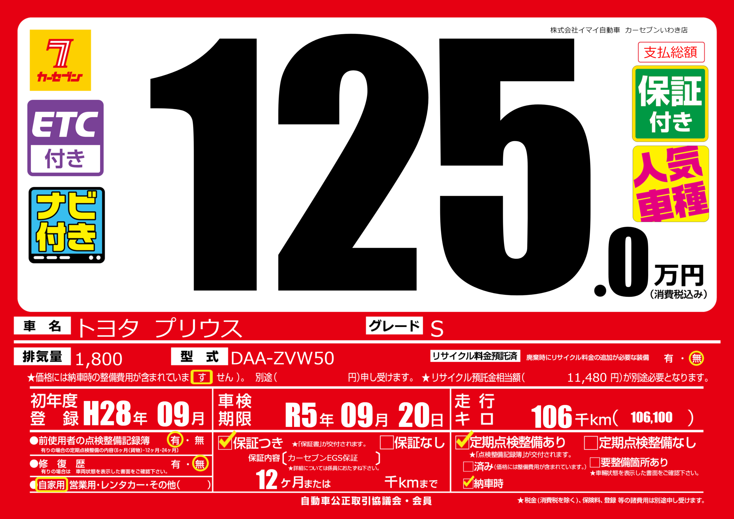 | 車検制限 | R5年 09月 20日 | ||