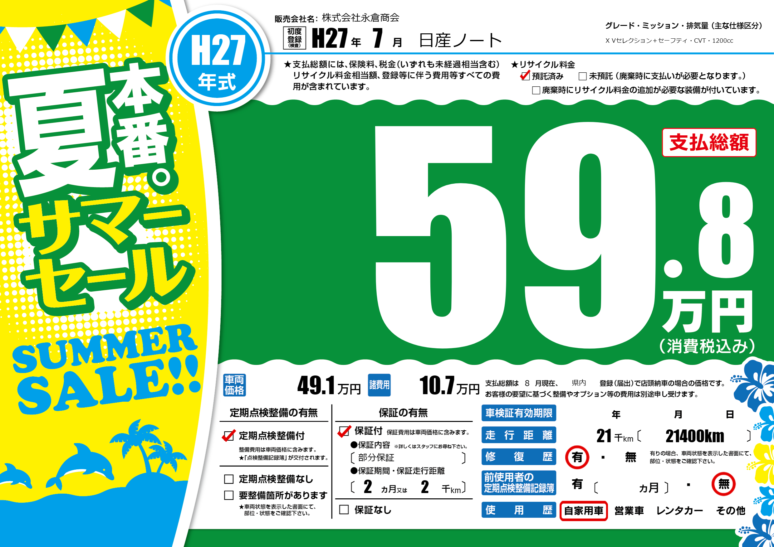 | 走行キロ | 2.1万km | 初年度登録 | H27年7月 |