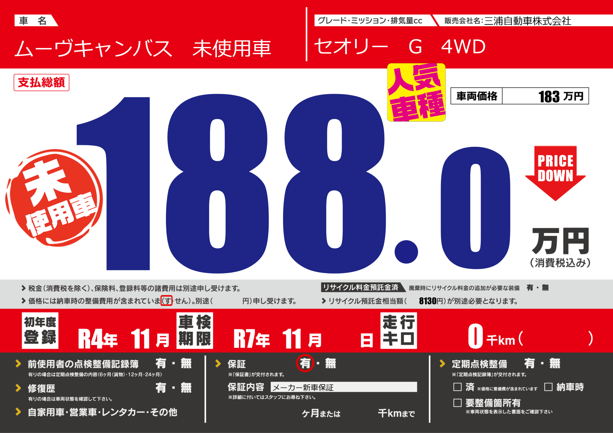 | 車名 | ムーヴキャンバス 未使用車 | グレード ミッション 排気量 |