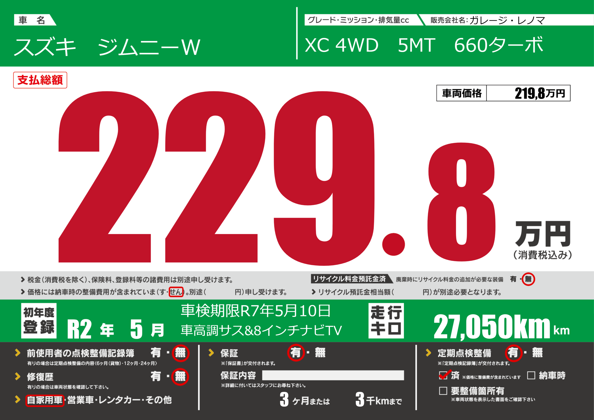 | 定期点検整備 | 定期点検整備あり 定期点検整備済み | ||