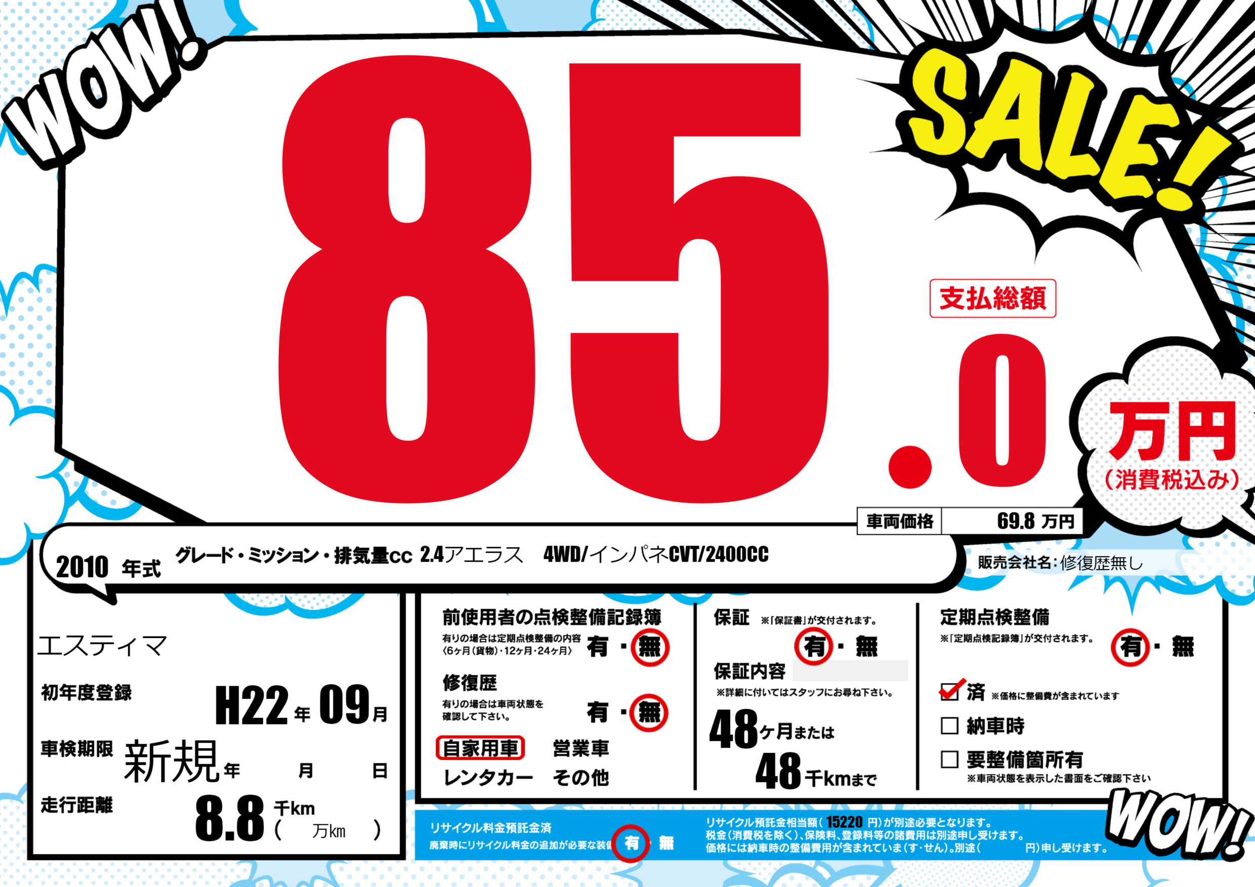 | 定期点検整備 | 定期点検整備あり 定期点検整備済み | ||
