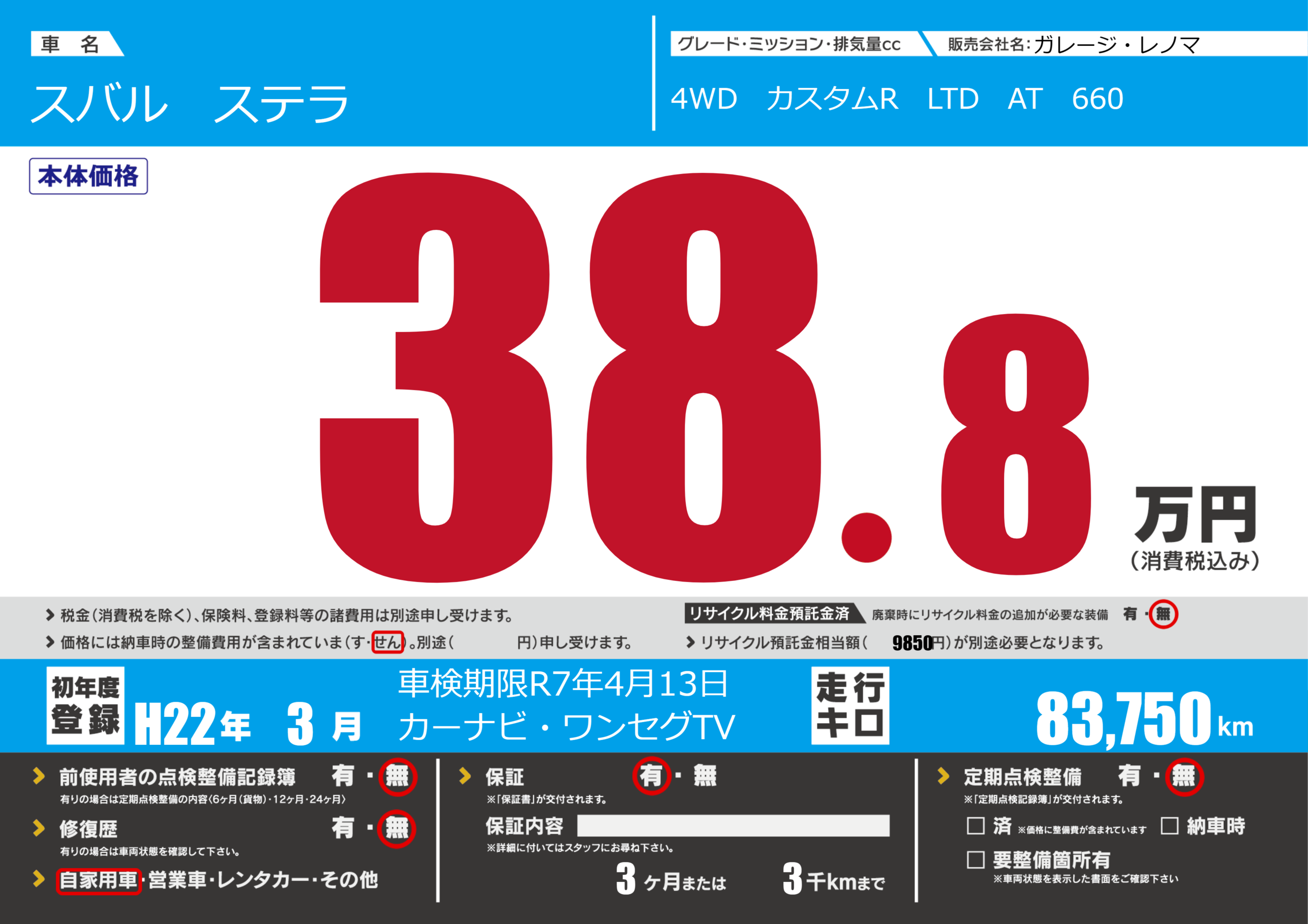 | 車名 | スバル ステラ | グレード ミッション 排気量 |