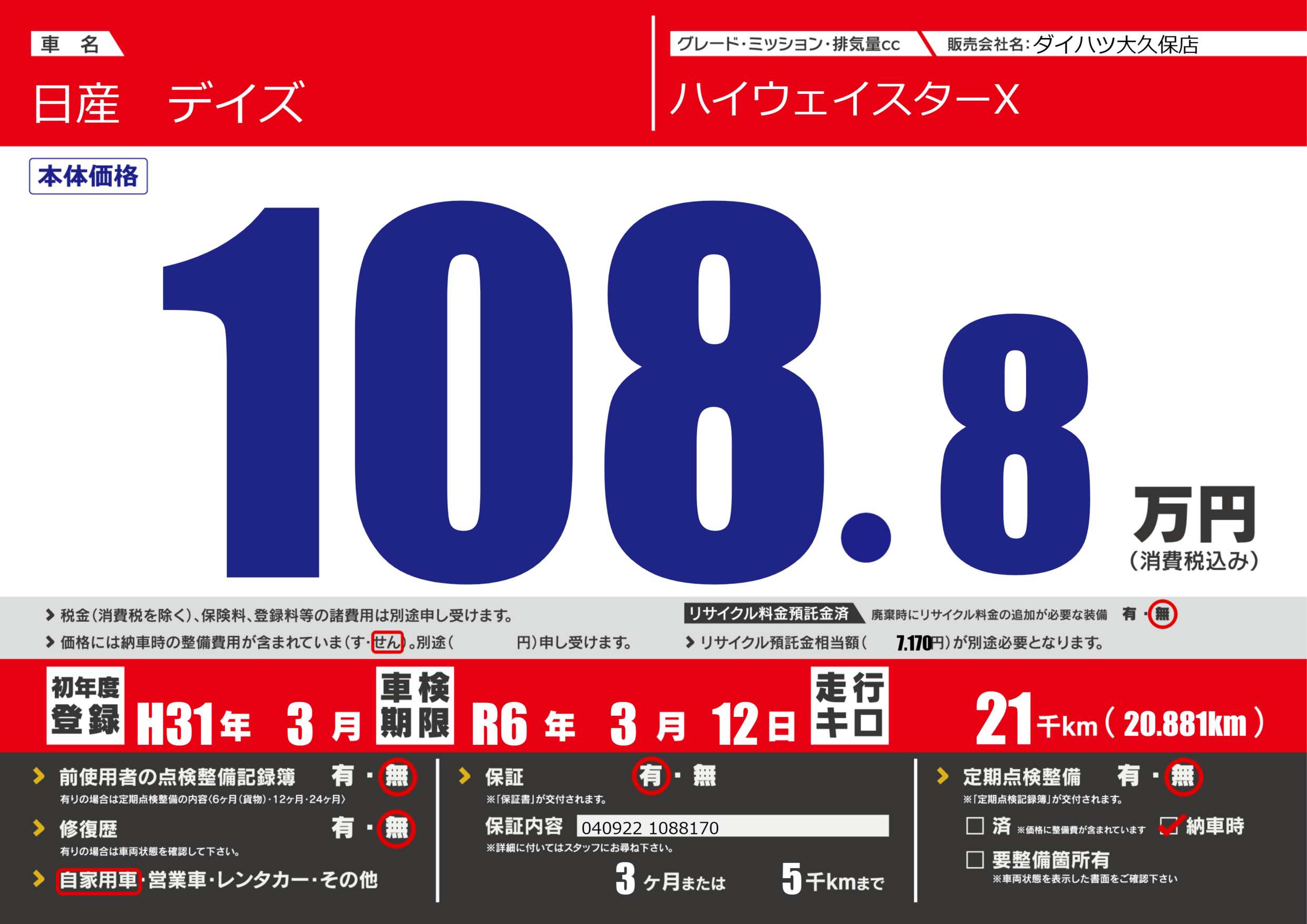 | 車名 | 日産 デイズ | グレード ミッション 排気量 |