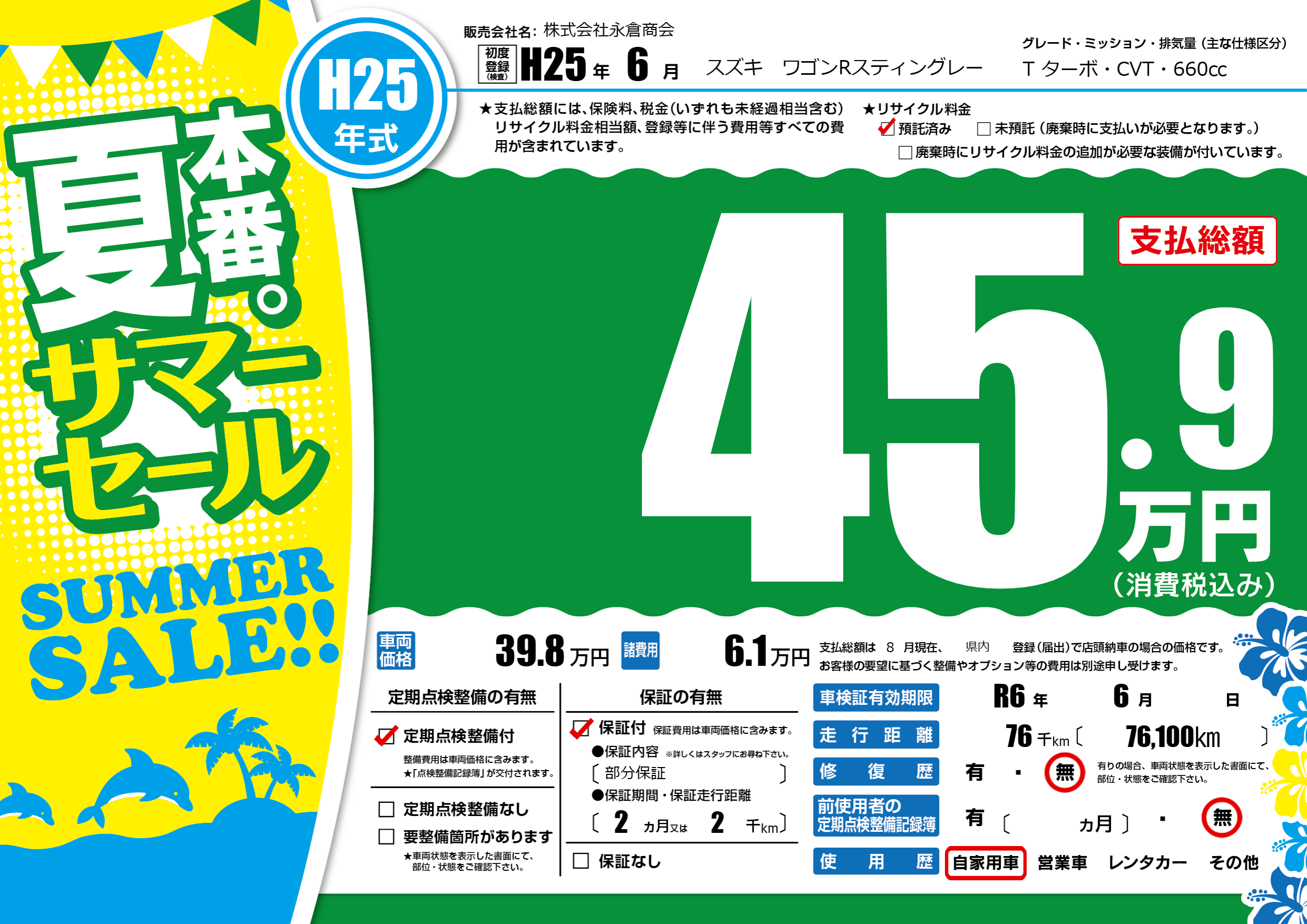 | 走行キロ | 7.6万km | 初年度登録 | H25年6月 |
