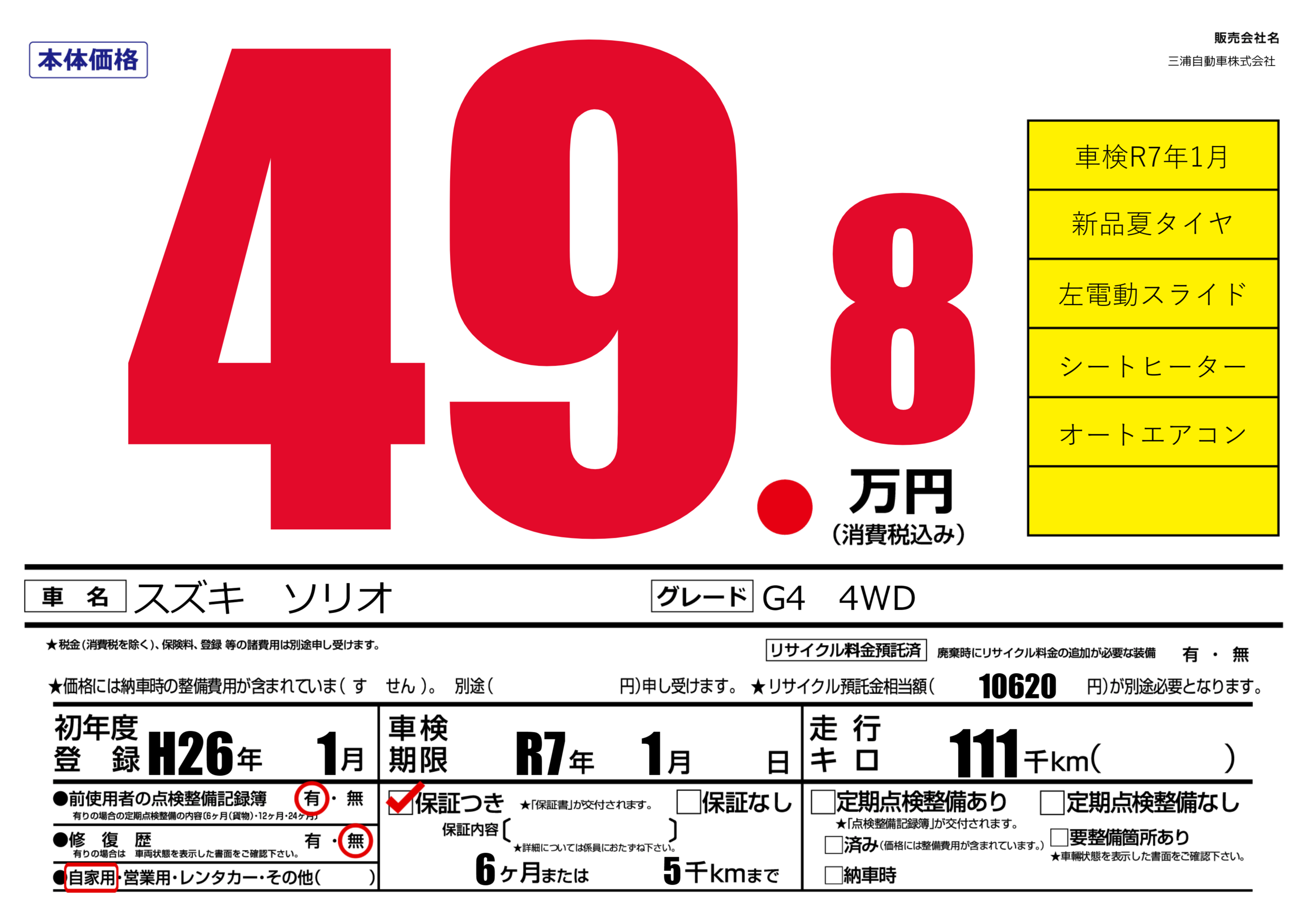 | 車名 | スズキ ソリオ | グレード ミッション 排気量 |