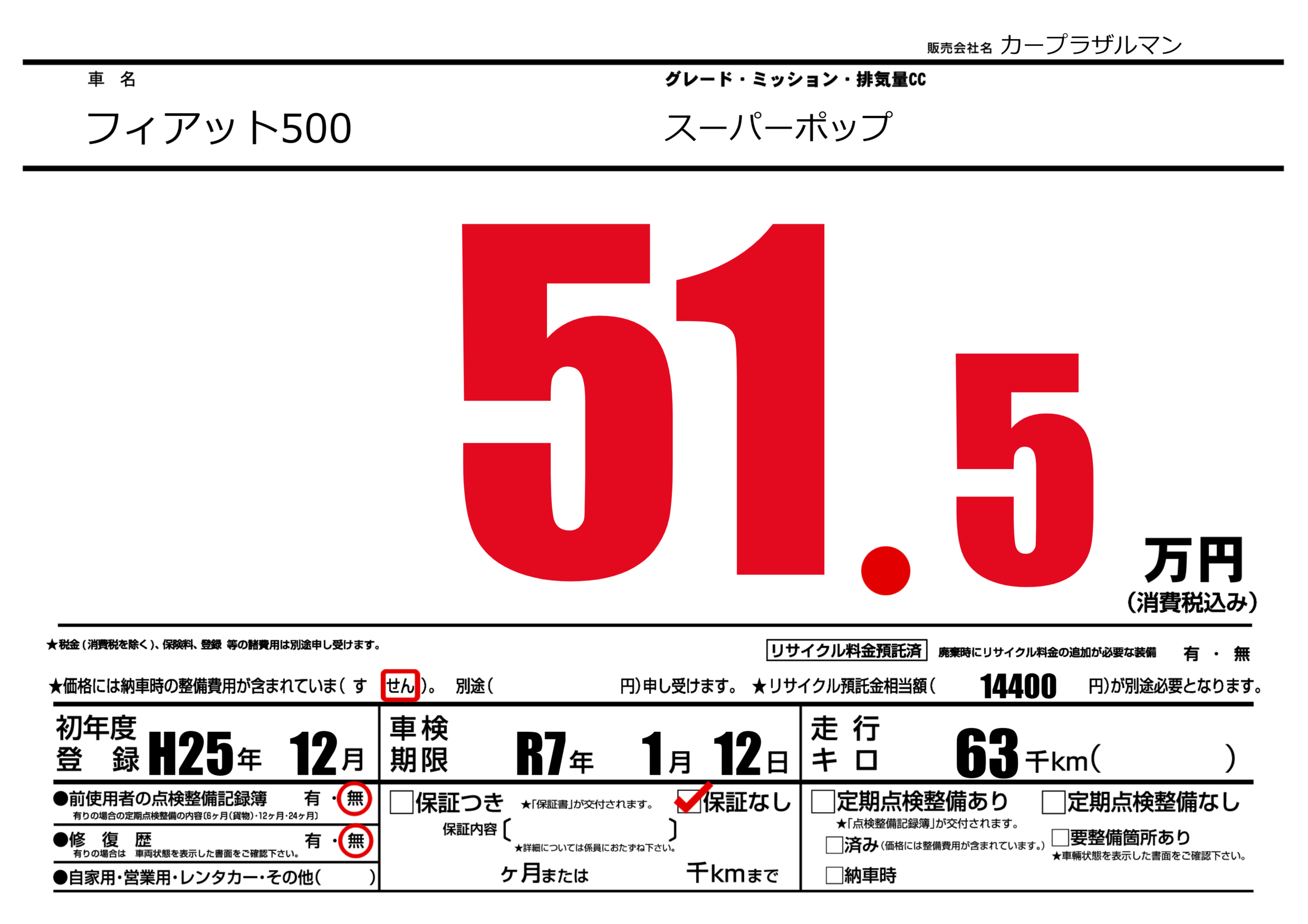 | 車名 | フィアット500 | グレード ミッション 排気量 |