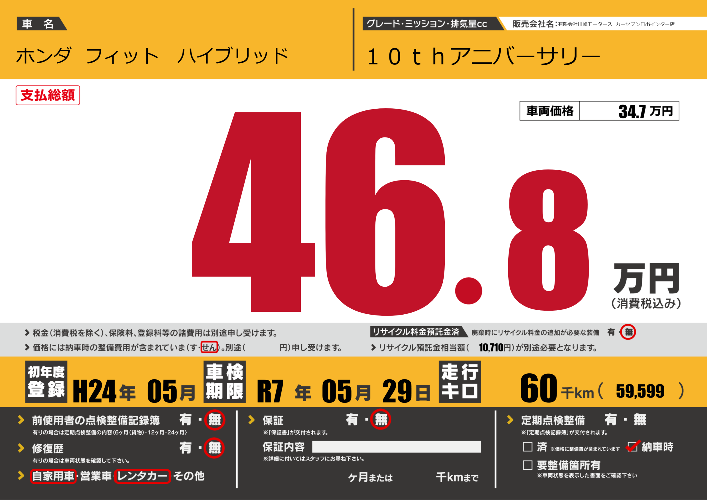 | 車名 | ホンダ フィット ハイブリッド | グレード ミッション 排気量 |
