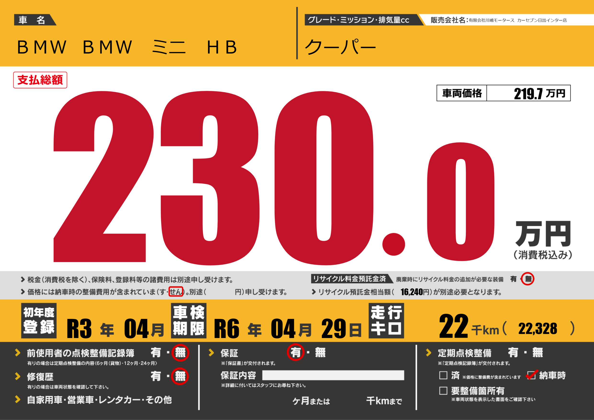 | 車名 | BMW BMW ミニ HB | グレード ミッション 排気量 |