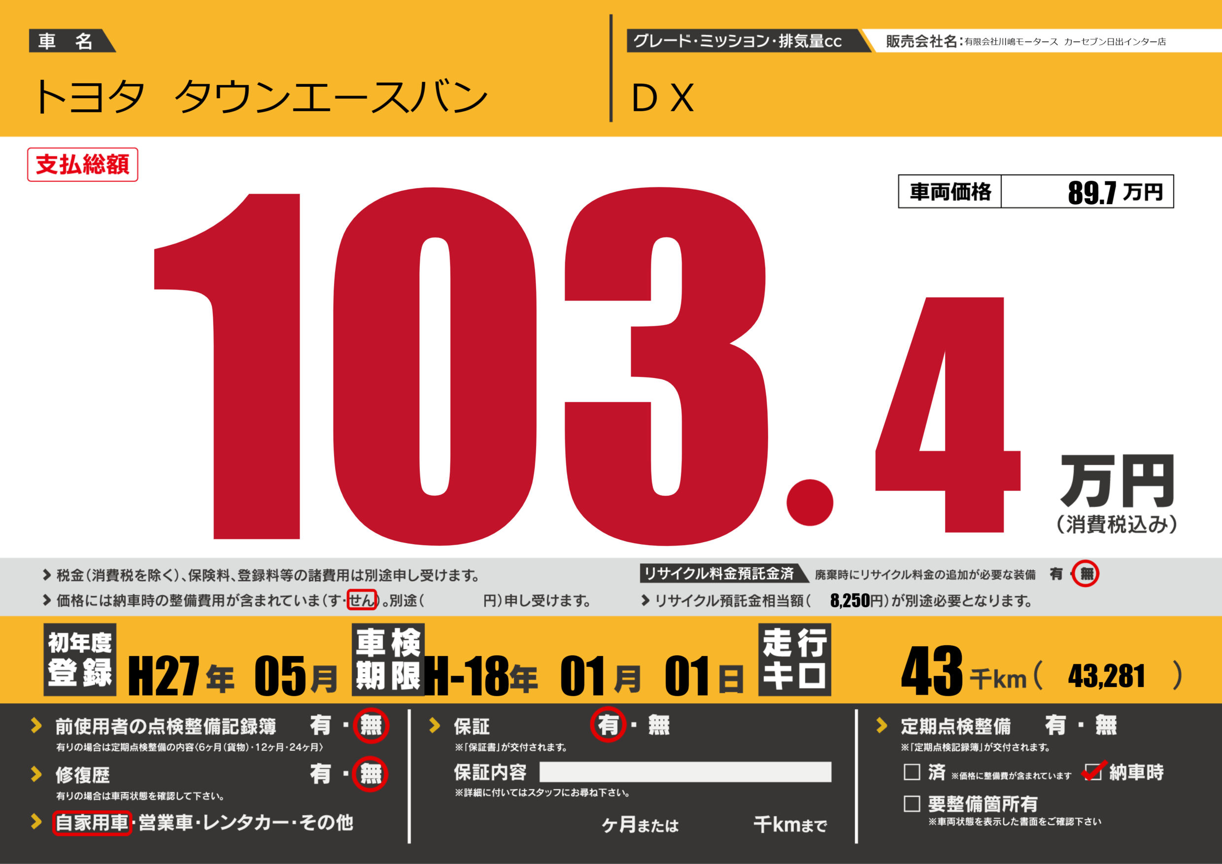| 車名 | トヨタ タウンエースバン | グレード ミッション 排気量 |