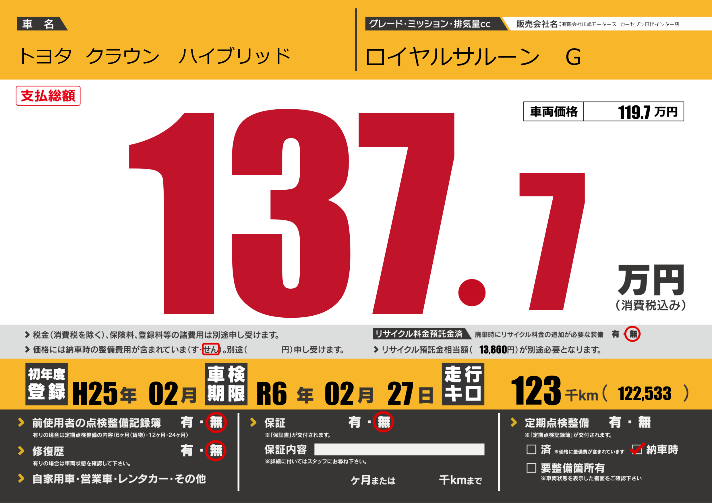 | 車名 | トヨタ クラウン ハイブリッド | グレード ミッション 排気量 |