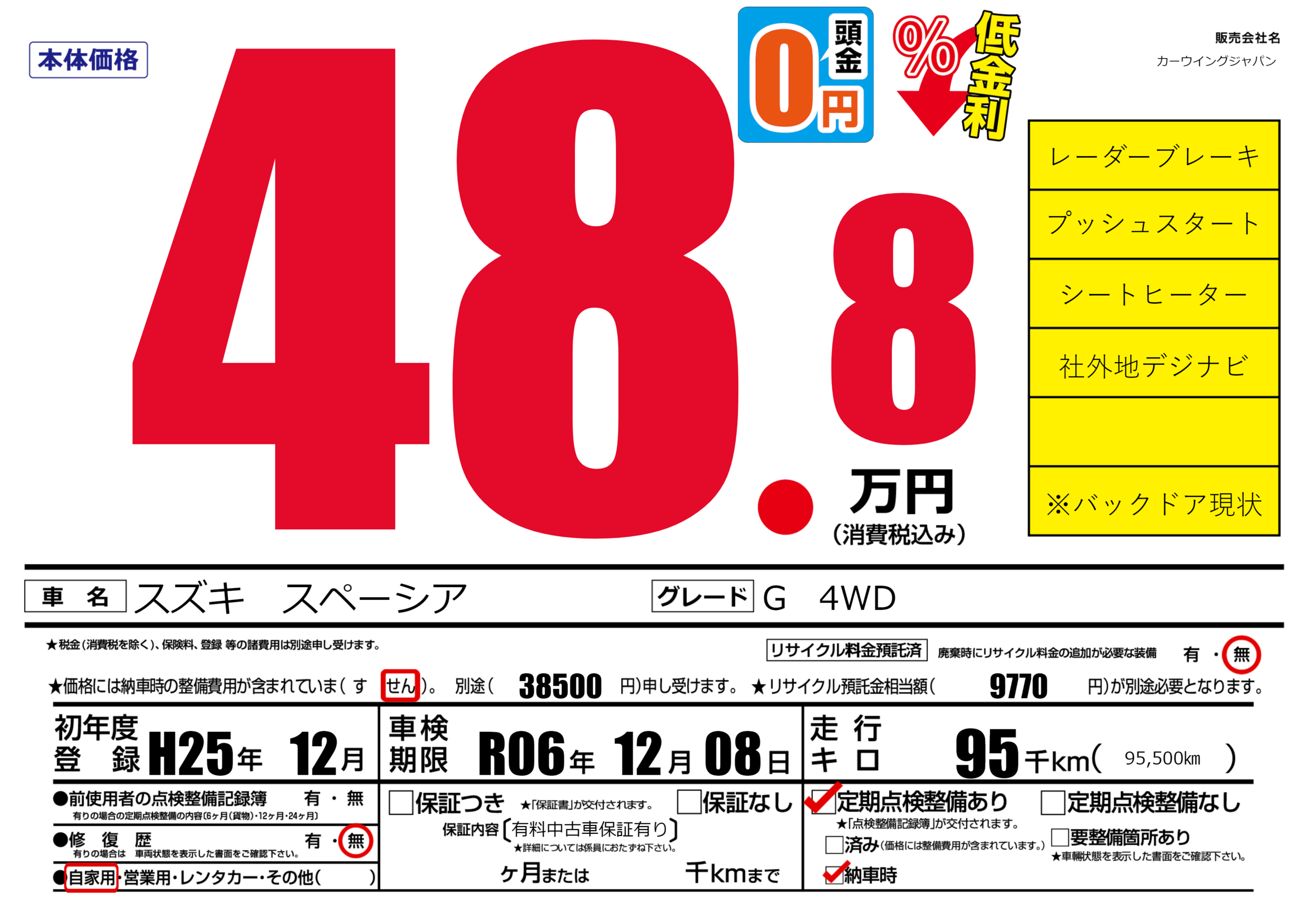 | 車名 | スズキ スペーシア | グレード ミッション 排気量 |