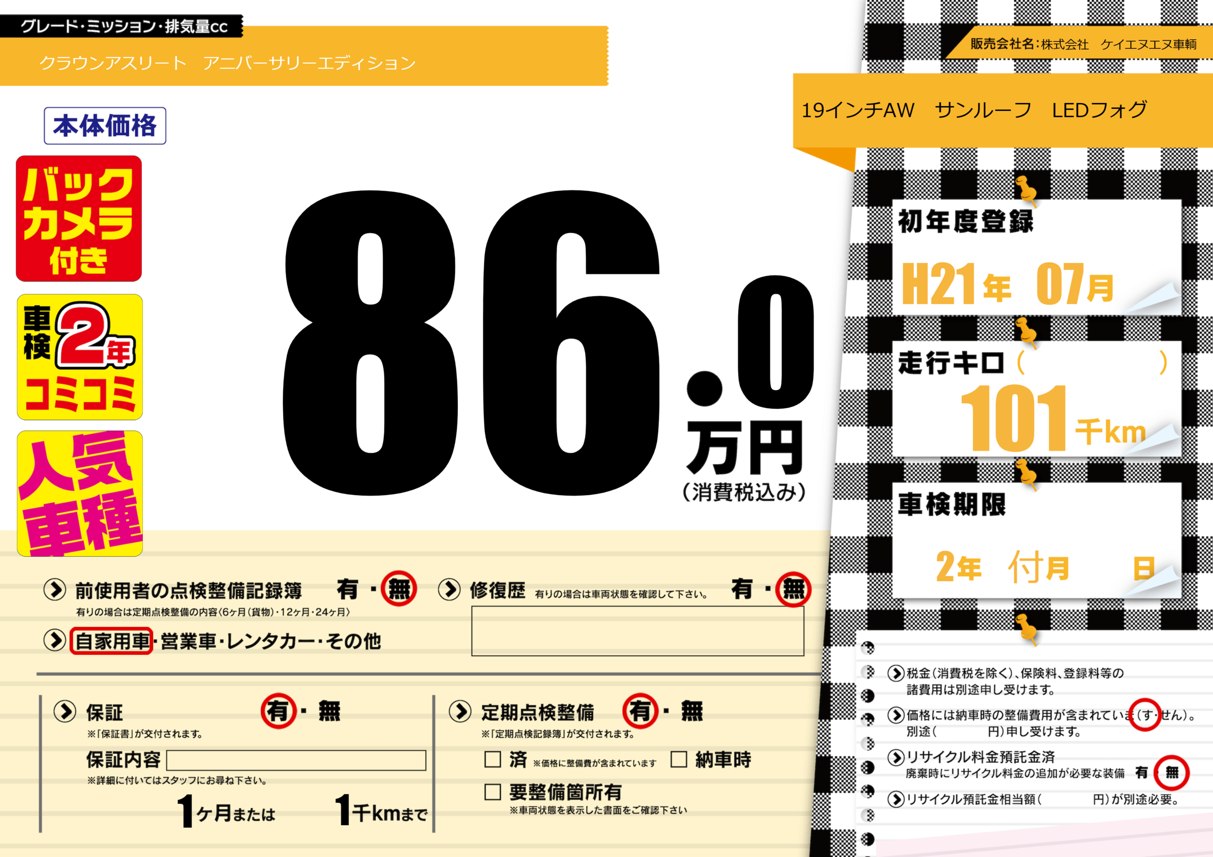 保証付き 保証内容(---) 1ヶ月または(1)千kmまで |