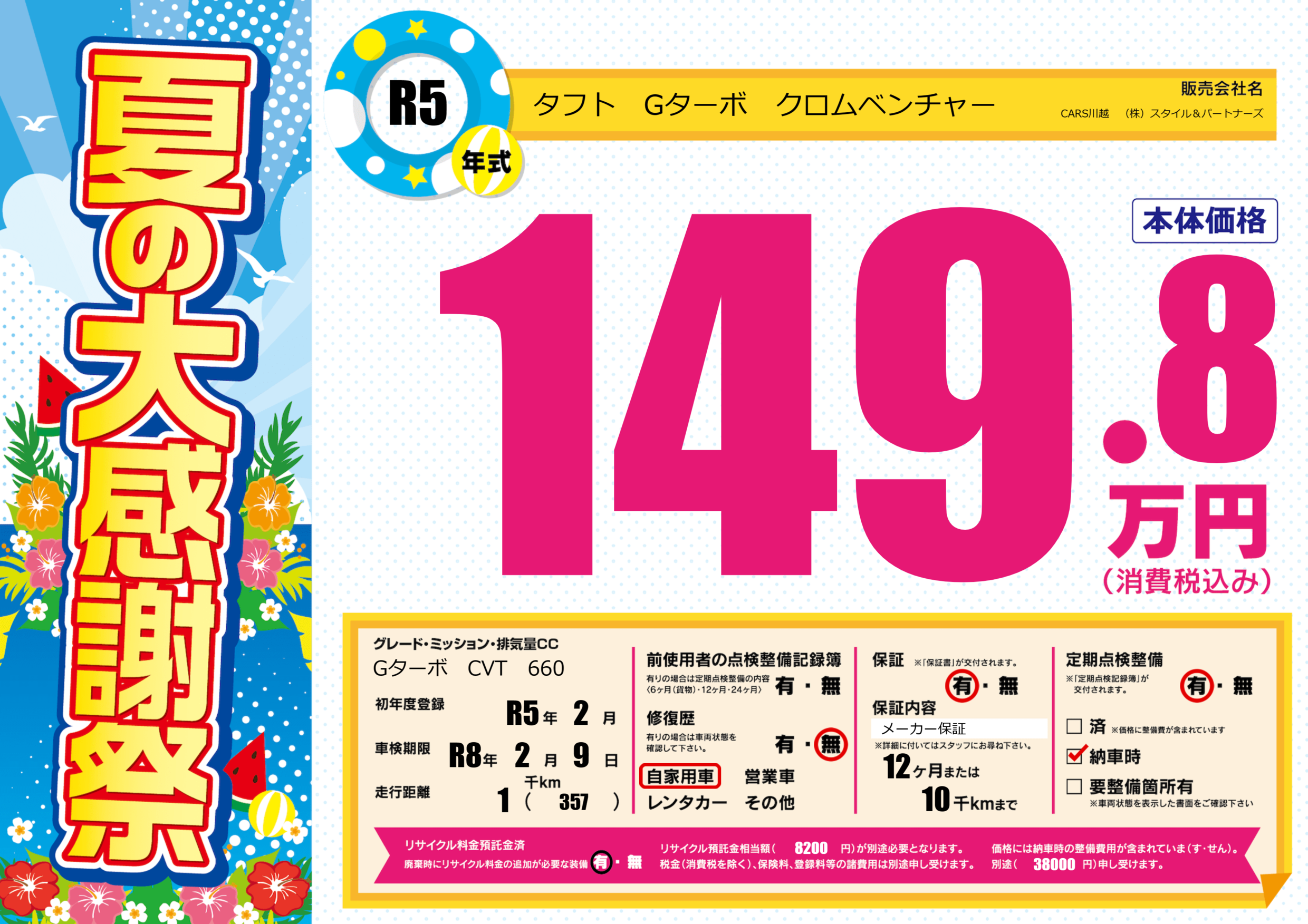 | 走行キロ | 0.1万km | 初年度登録 | R5年2月 |