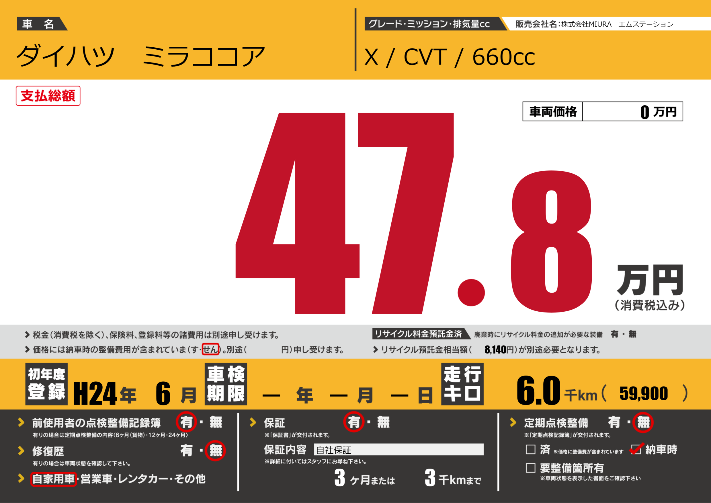 | 車名 | ダイハツ ミラココア | グレード ミッション 排気量 |