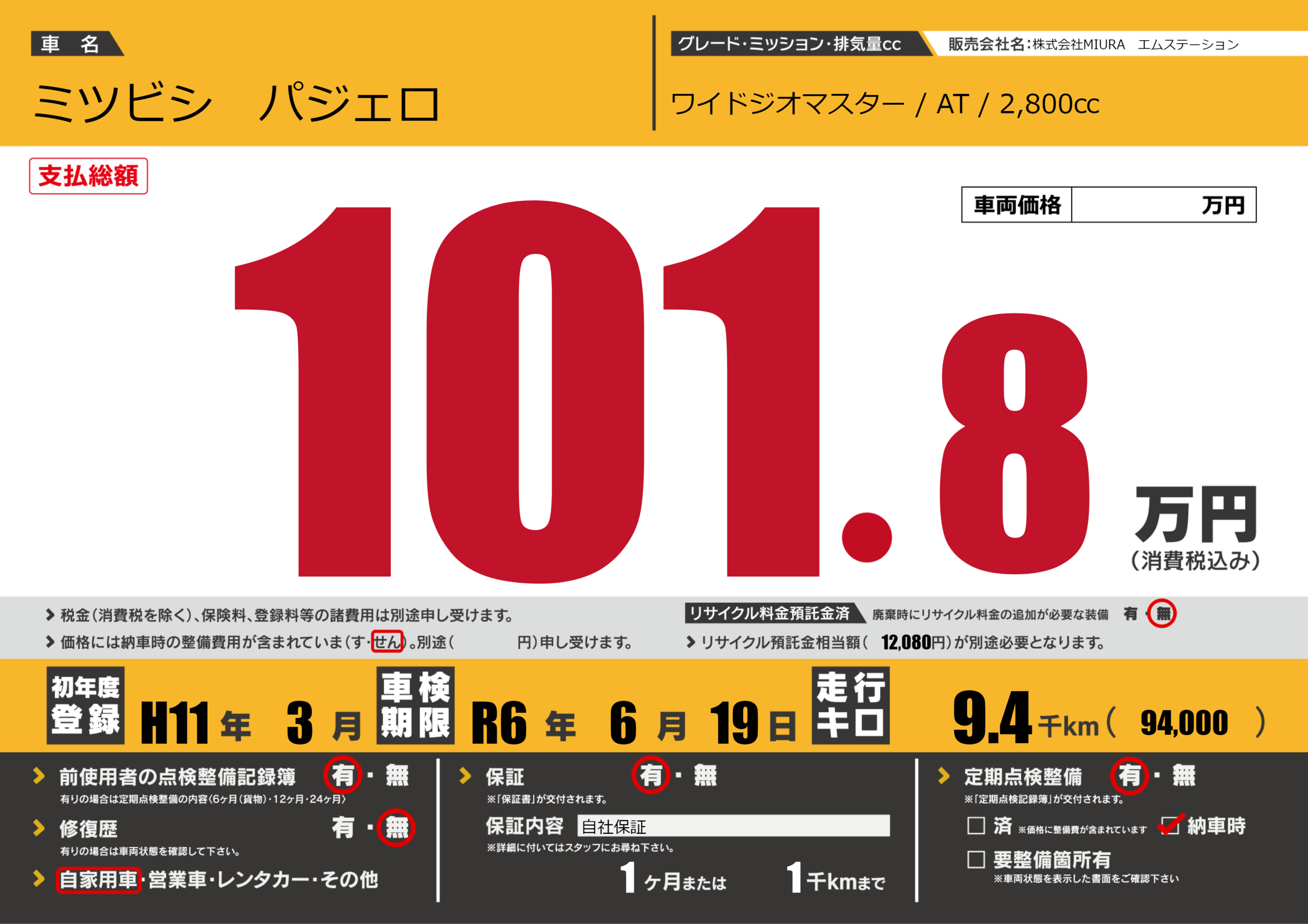 | 車名 | ミツビシ パジェロ | グレード ミッション 排気量 |