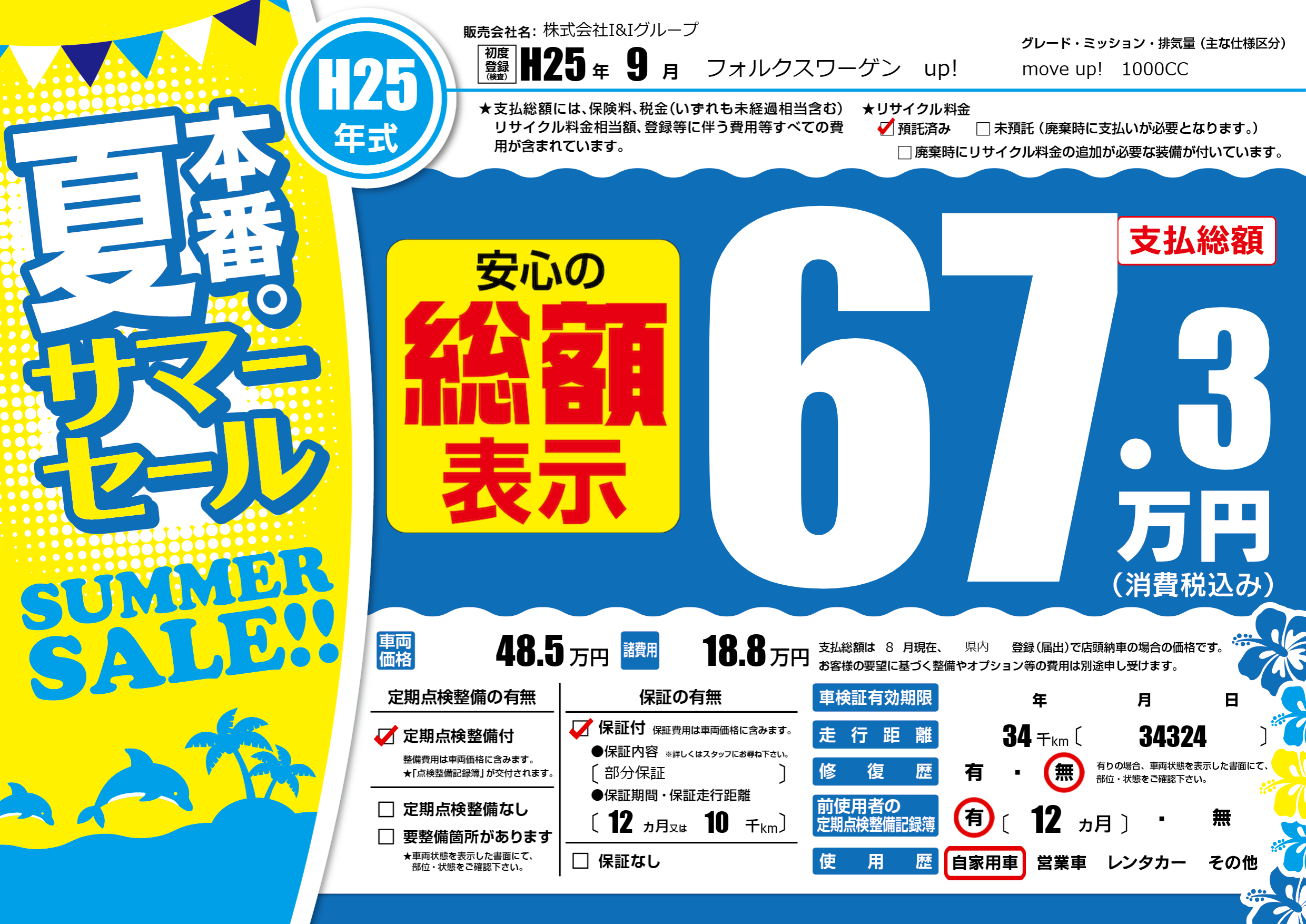 | 走行キロ | 3.4万km | 初年度登録 | H25年9月 |