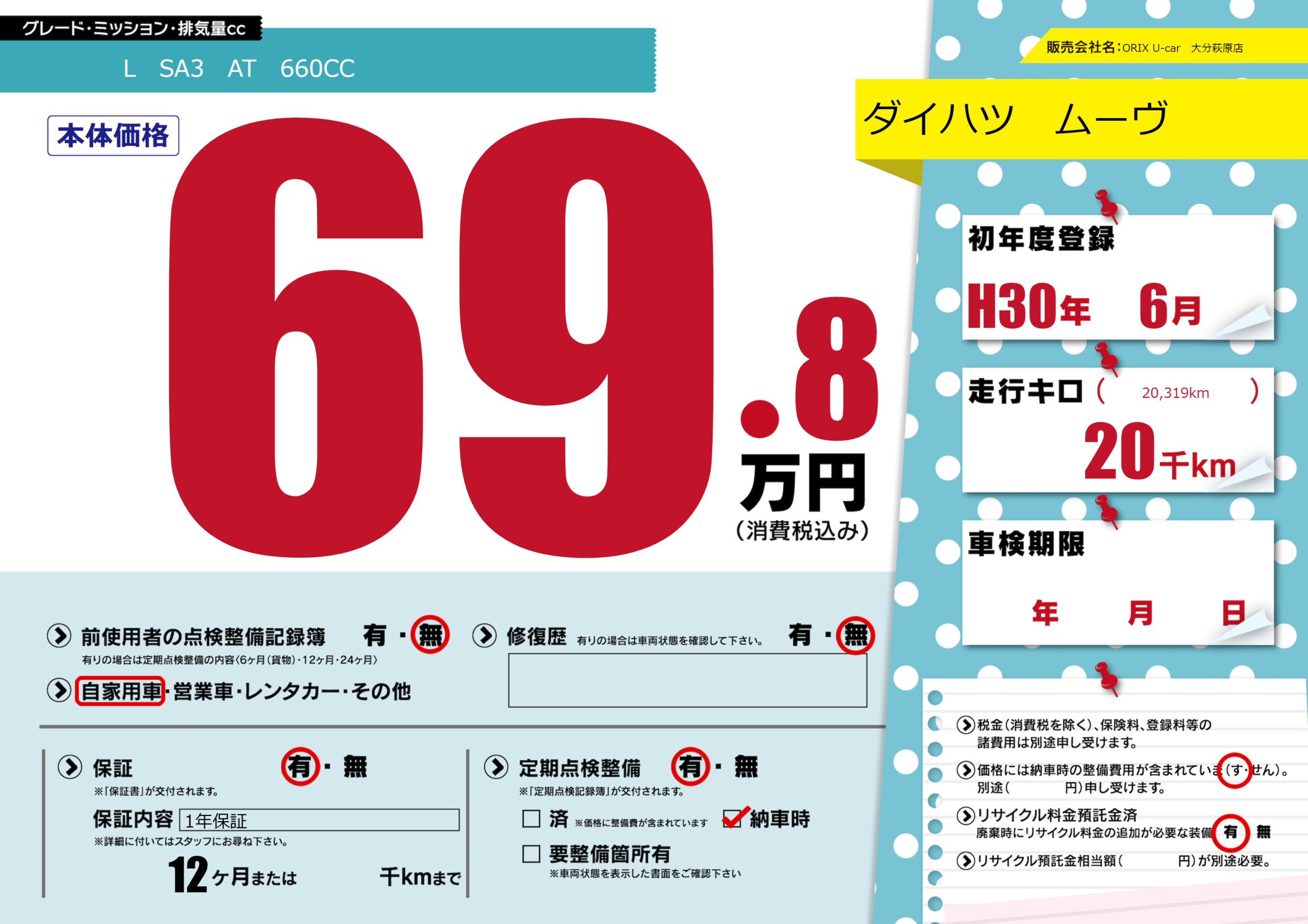 保証付き 保証内容(1年保証) 12ヶ月または()千kmまで |