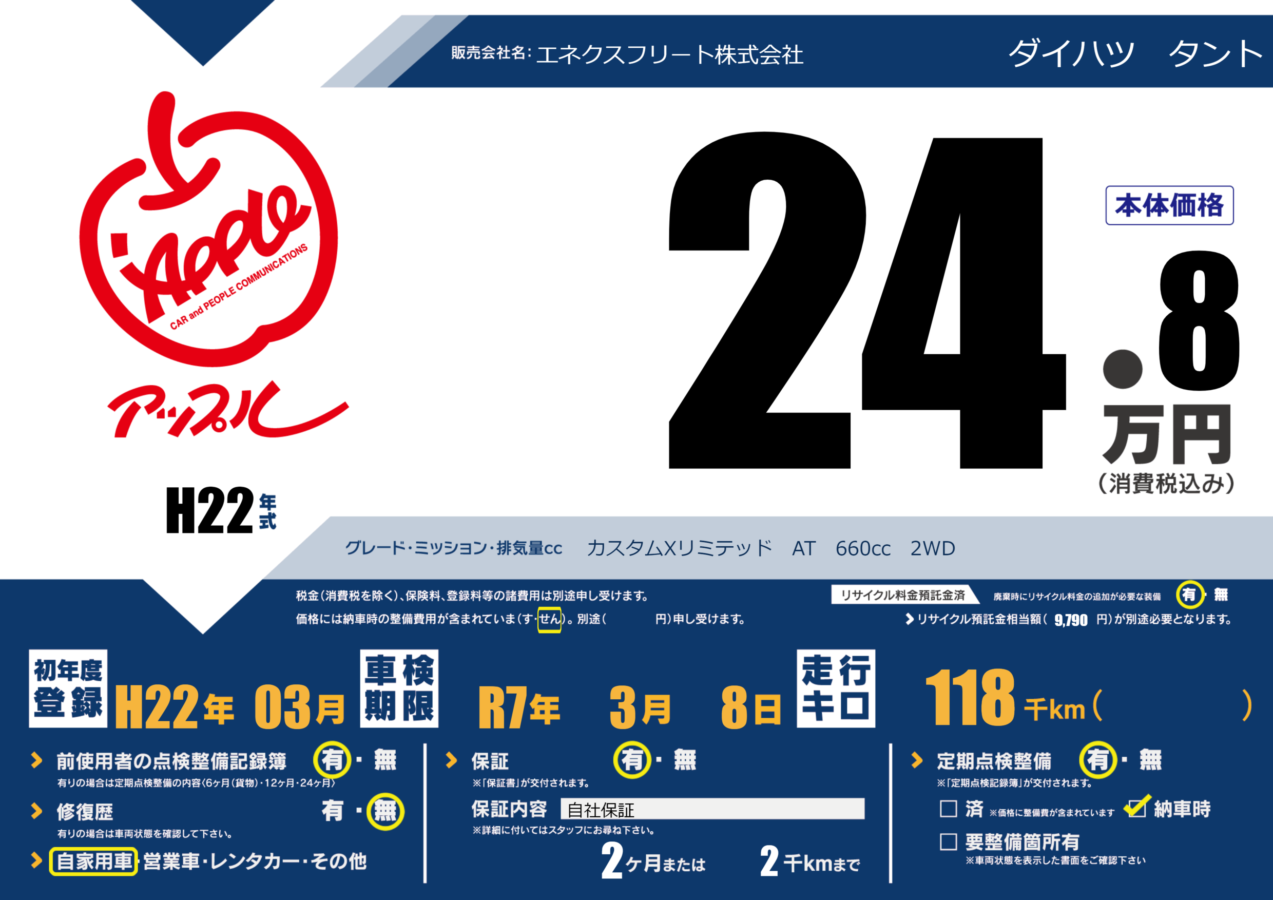 | 車名 | ダイハツ タント | グレード ミッション 排気量 |