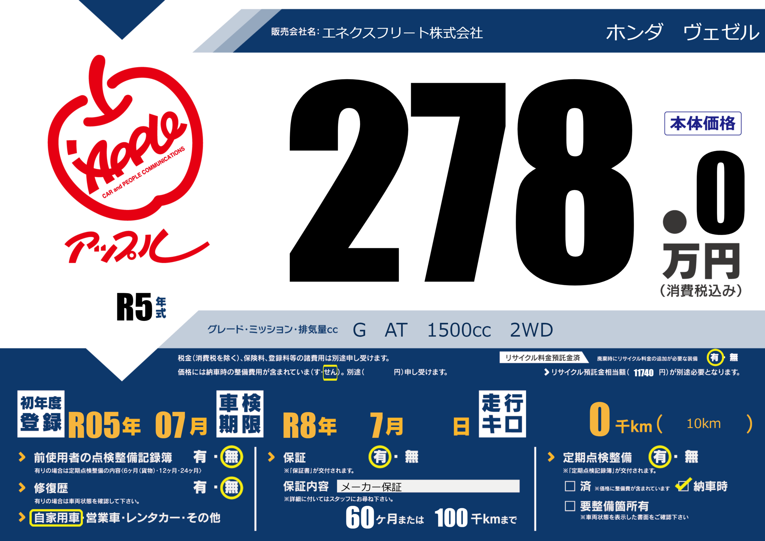 | 車名 | ホンダ ヴェゼル | グレード ミッション 排気量 |